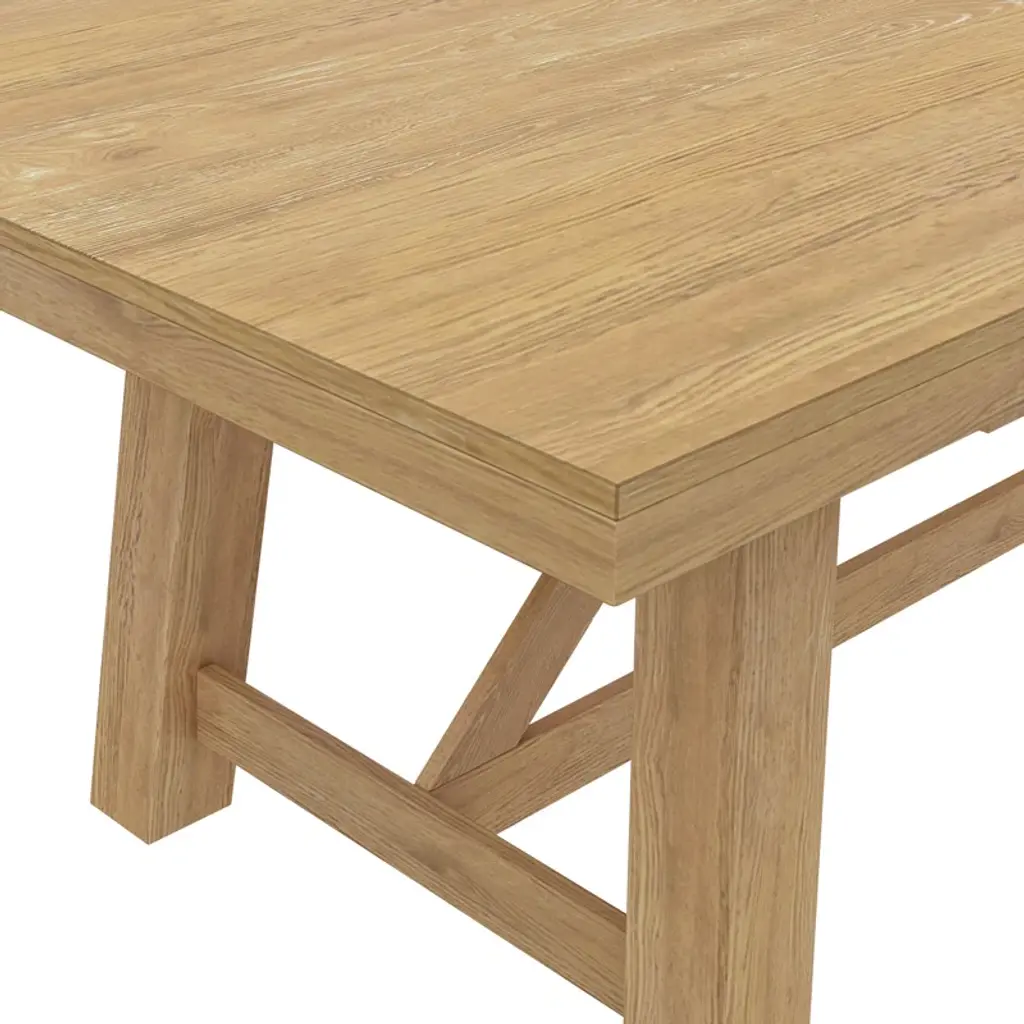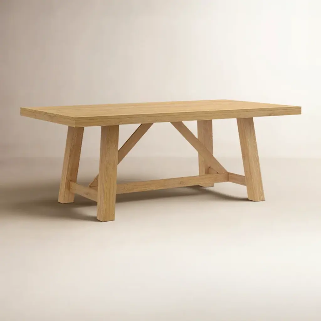 Inspired by classic craftsmanship and modern simplicity, the Cendejas Dining Table brings warmth, character, and enduring beauty to your home. Built from rubberwood solids with a rich oak veneer top, its natural finish enhances the organic wood grain, creating an inviting space for shared meals and meaningful moments.Designed for both style and stability, the table features a bold trestle base with angled legs and cross-brace support, adding a touch of rustic charm while ensuring lasting durability. With its spacious 78”L x 42”W fixed top, it comfortably seats 6-8 guests, making it the perfect centerpiece for family gatherings, dinner parties, or cozy conversations.Part of the Cendejas Collection, this table embodies a timeless aesthetic—where farmhouse inspiration meets contemporary elegance. Whether styled with classic chairs or a modern bench, the Cendejas Dining Table transforms every meal into an experience worth savoring.