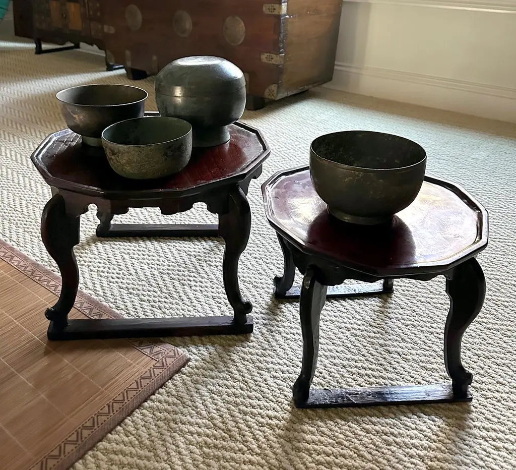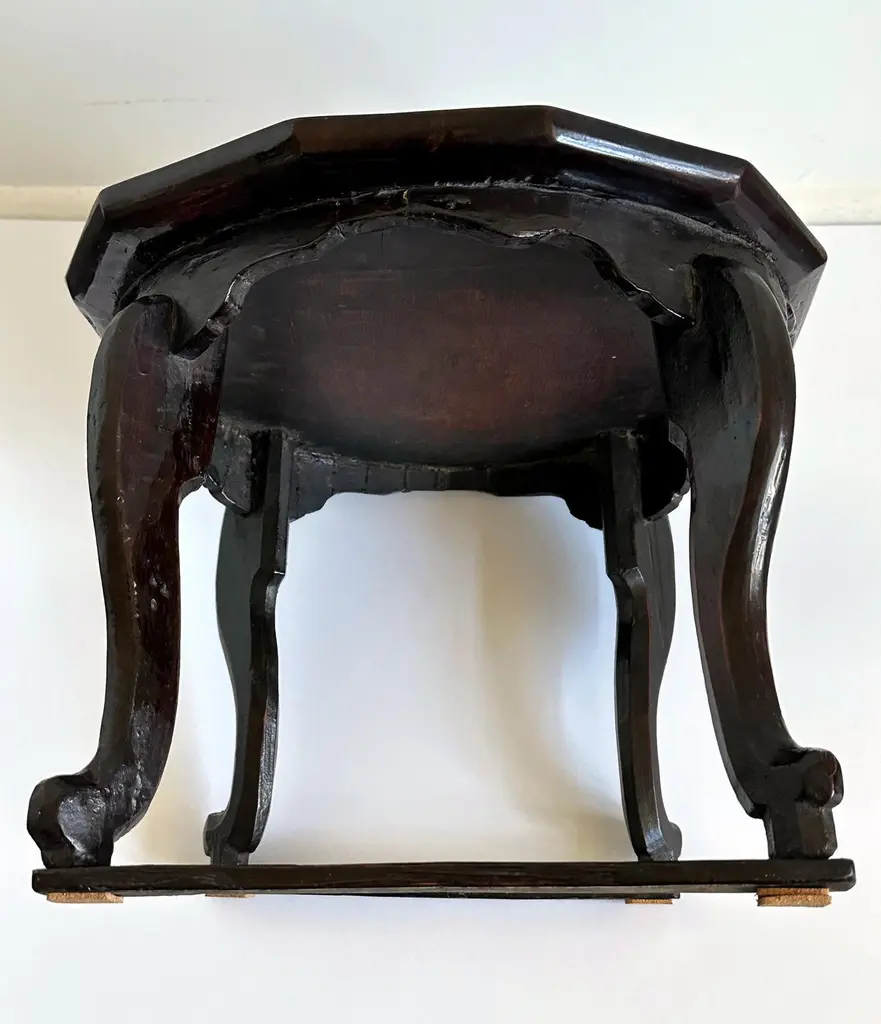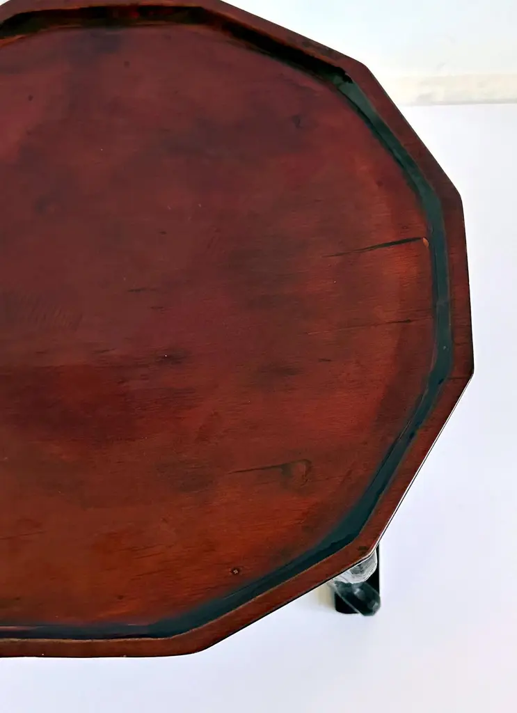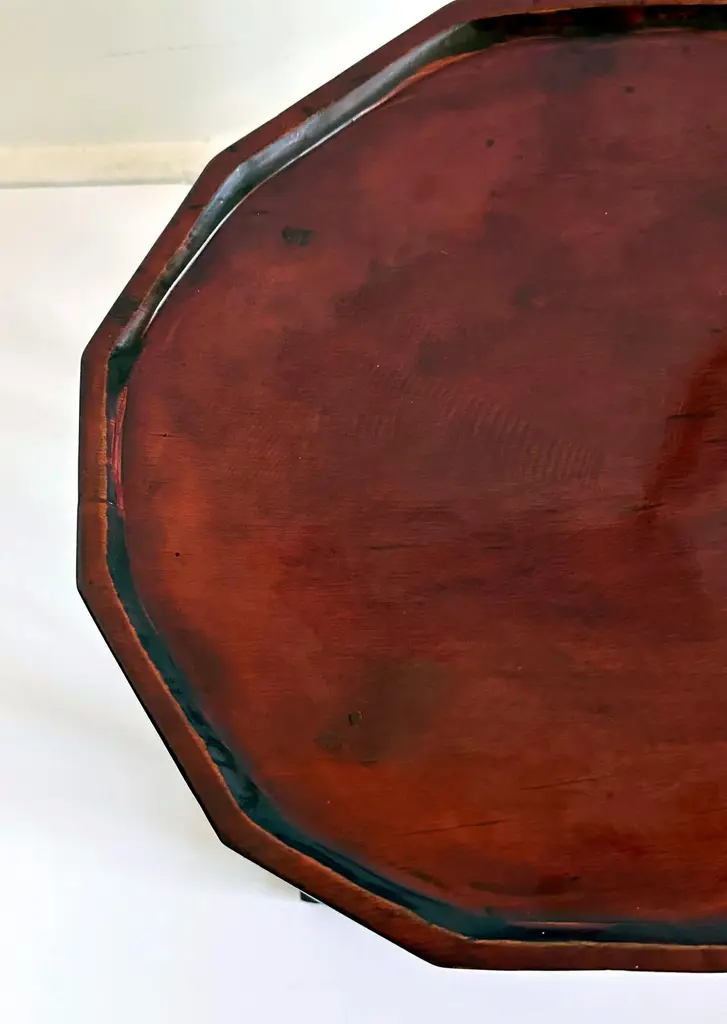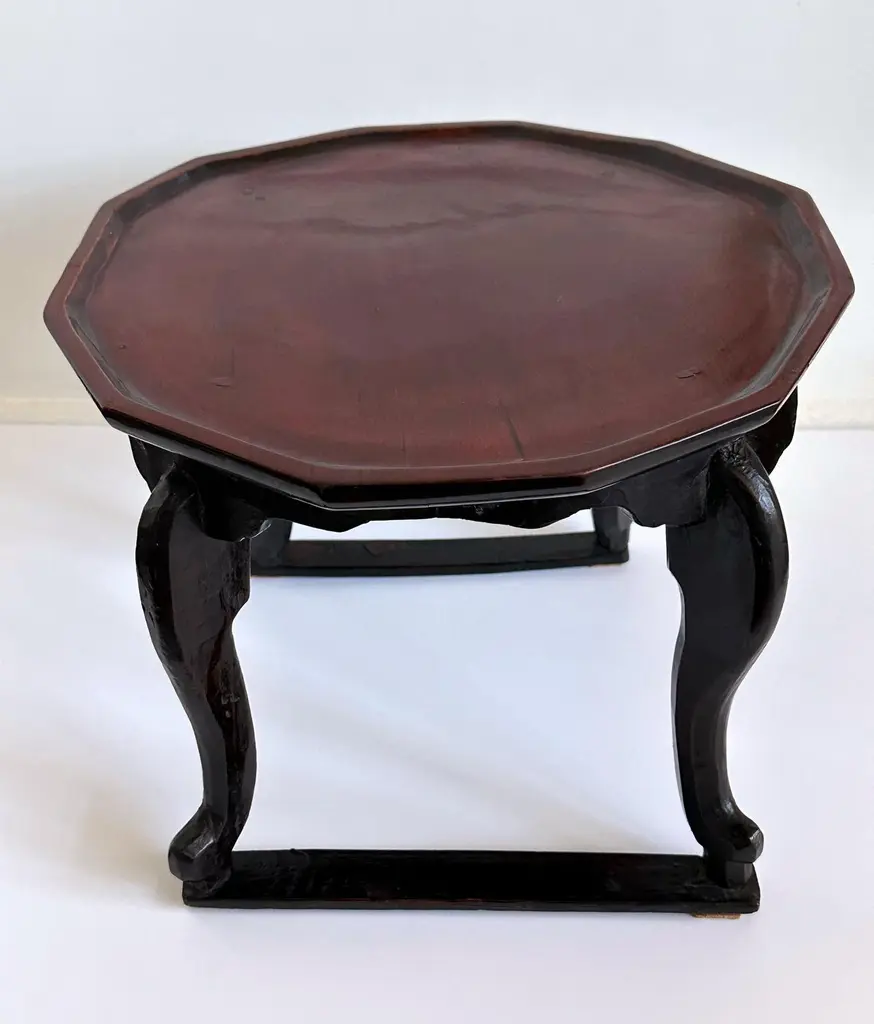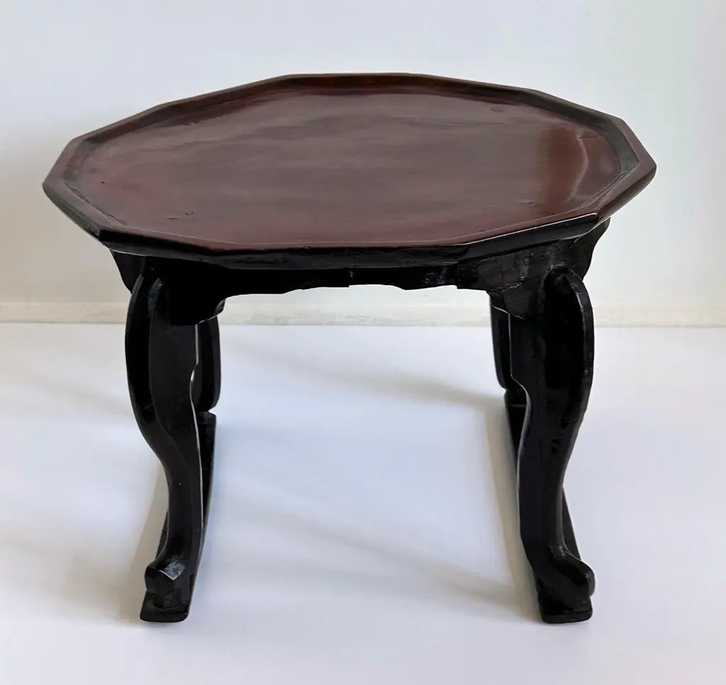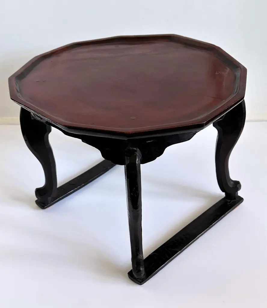 A small antique wood table from Korea from turn of the 20th century (end of Joseon Dynasty). This type of light weight table is called "Soban" in Korean. which means "Small Tray". It was widely used primarily as individual dining table to present and serve foods, but also as small desk, incense burner holder and altar table. Its lightweight and low profile fits the traditional personal and portable use on the floor. The current table on offer was likely made from Ginko wood and finished in a red lacquer. The top surface with the slightly raised rim has a twelve-sided shape with soft corners. Its surface has a glossier finish compared to the legs, possibly due to the extensive use and reapplication of lacquer over the time. The table is supported by four outwardly turned legs resembling the legs of tiger, therefore this specific type is also known as "Hojokban" (Tiger Leg Tray). Two stretcher bars connect the legs for further stabilization. This is an antique piece and displays wonderful patina from use and care over the years. It is mostly intact, but we did observe historical reinforcement by tiny metal nails on the bottom of the legs where the stretcher attaches.The National Folk Musuem of Korea in Seoul has a large collection of similar Hojokbans such as item 000213, 001516 and 001626.
