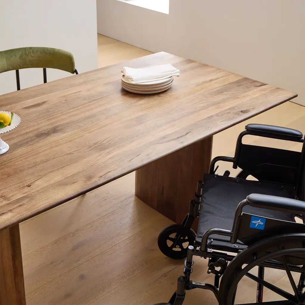 A substantial table with graceful lines. Crafted from solid, sustainably sourced wood. Designed to be accessible with room for all. Contract Grade, so you know it's built to last.