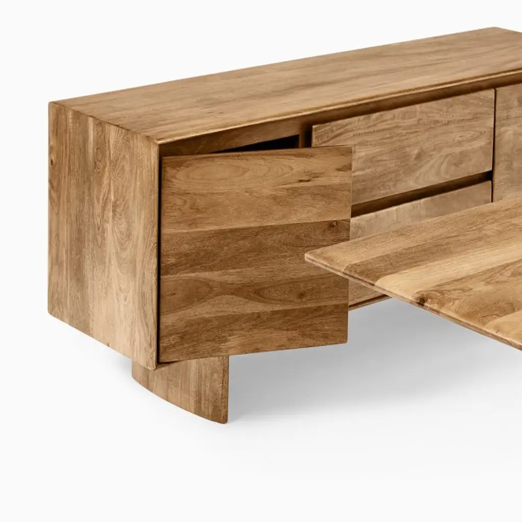 Kiln-dried solid mango wood in a Burnt Wax finish. Includes: 1 Anton Solid Wood 72" Dining Table and 1 Anton Solid Wood Buffet. Comfortably seats up to: 6. Natural variations in wood color and grain make each piece one of a kind. The mango wood used on this product is sustainably sourced from trees that no longer produce fruit. Legs include built-in levelers. One media cutout at back for cord management. For residential use only. 2 drawers open on metal glides.(Buffet) 2 compartments with 1 adjustable shelf each.(Buffet) This is a contract grade item is manufactured to meet the demands of commercial use in addition to residential. See more. Made in a Fair Trade Certified™ facility, directly benefiting the workers who make it. Made in India.