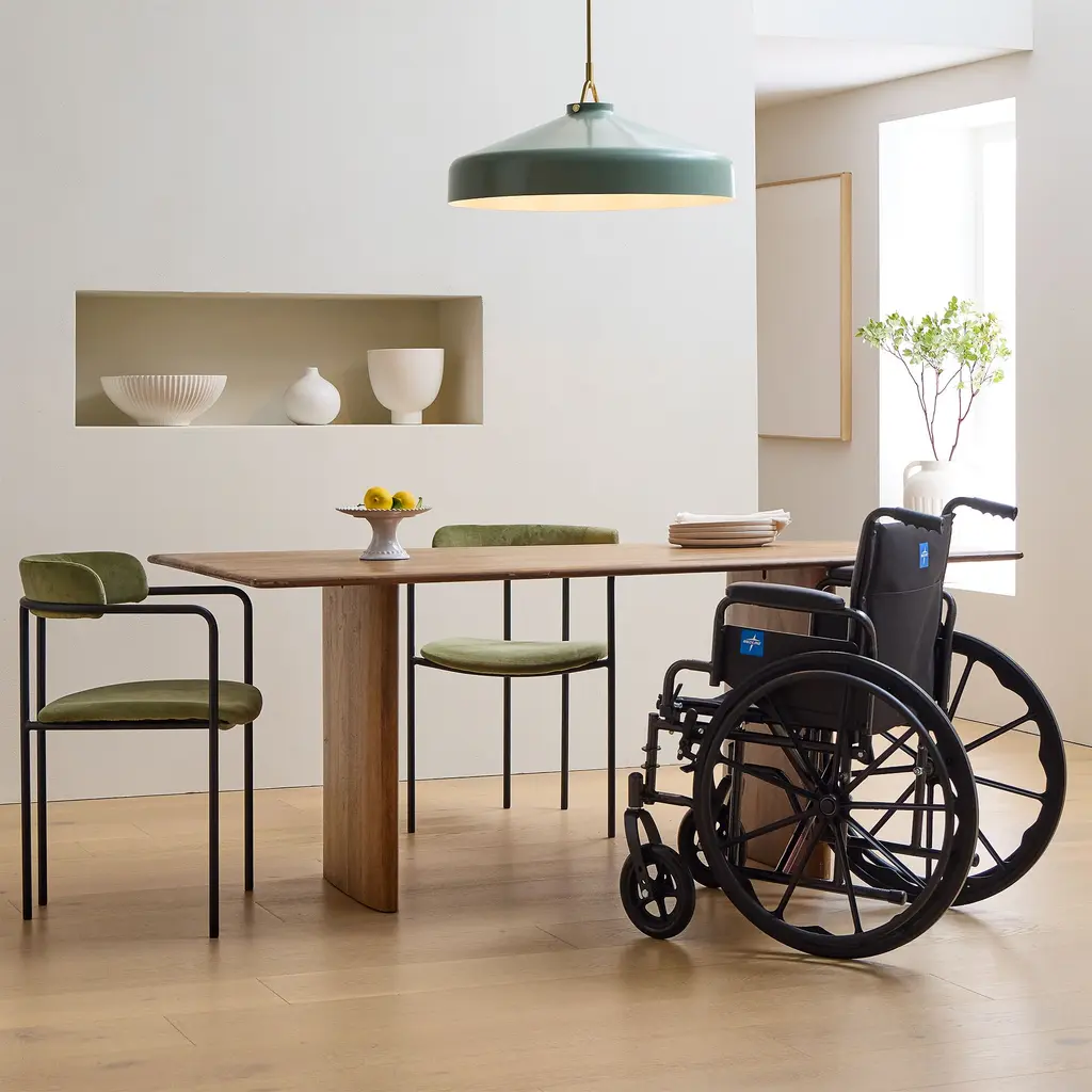 A substantial table with graceful lines. Crafted from solid, sustainably sourced wood. Designed to be accessible with room for all. Contract Grade, so you know it's built to last.