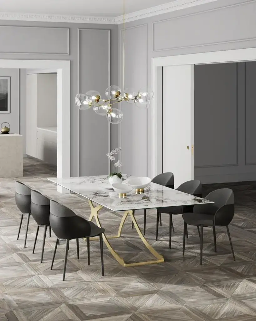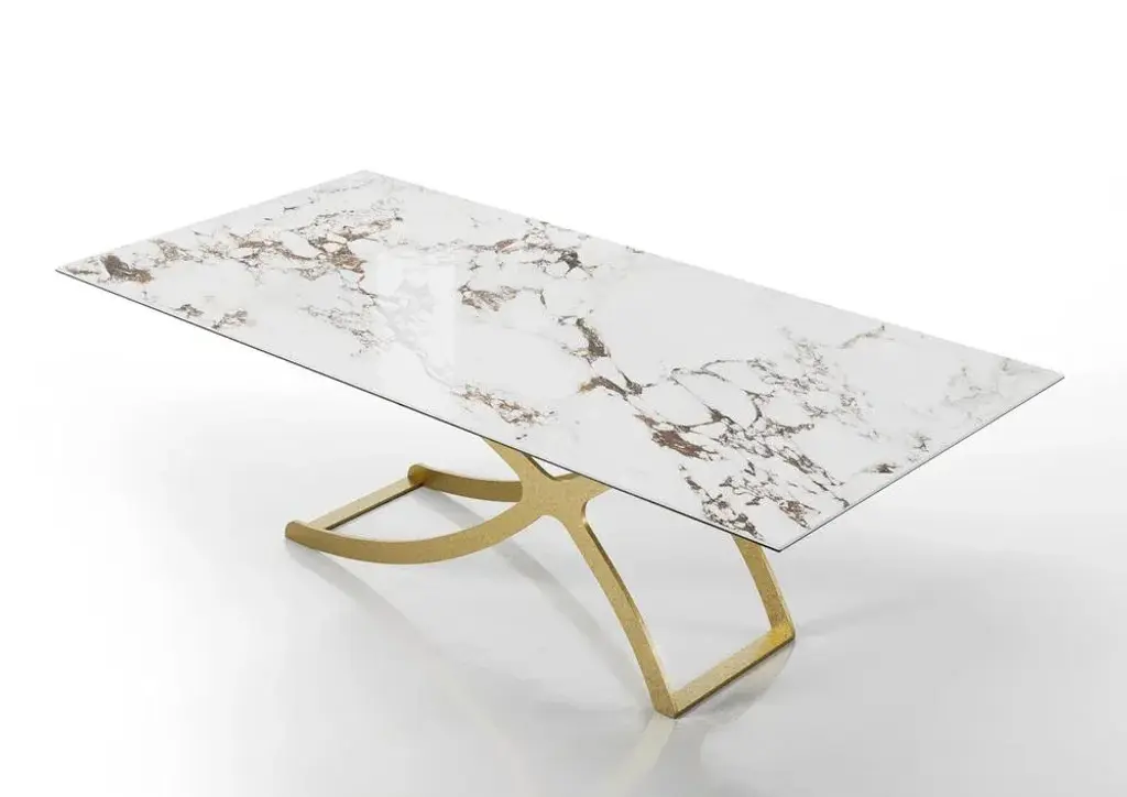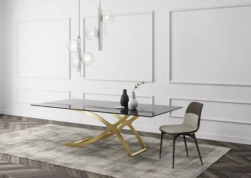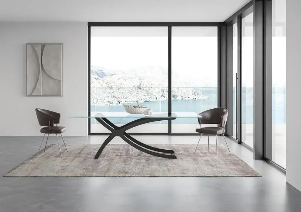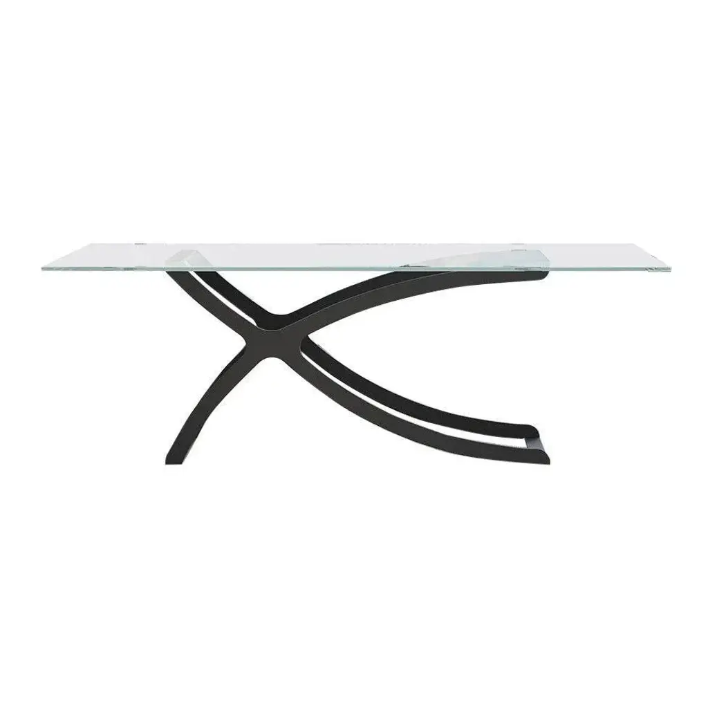 Apollo Dining Table by Chinellato Design Dimensions: W 250 x D 120 x H 72 cm Materials: Top: Extra Clear Tempered Glass Base: Matte Black Varnished The base, crafted from worked and welded steel, is available in Chabin Gold or Matte Black Paint finishes. Tops are available in Smooth Smoked Tempered Glass, Extra Clear Tempered Glass, and Glossy Capraia Ceramic with an Extra Clear Tempered Glass Under Top. Light and harmonious, Apollo presents itself as a rectangular dining table with a unique, sinuous, and lightweight supporting base that evokes the lyre played by Apollo, the god of music. To enhance it even further, the finishes are handcrafted, as is the case with all Chinellato Design compositions. The combinations of materials available for the top and the base finishes give rise to different styles to personalize the table: classic and refined with a marble-effect top and a Chabin Gold base, or modern, essential, and light with an extra clear tempered glass top and a base in the original Matte Black Varnished finish.