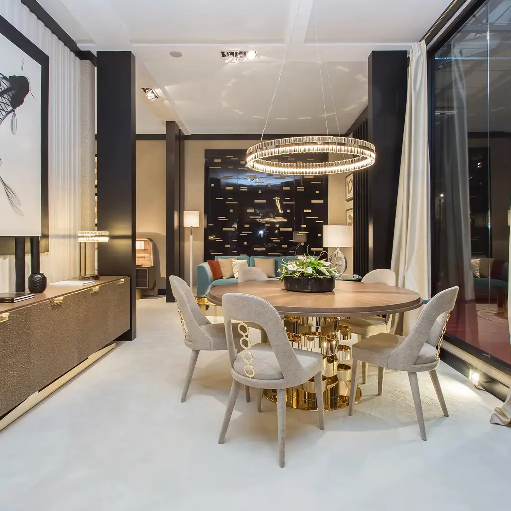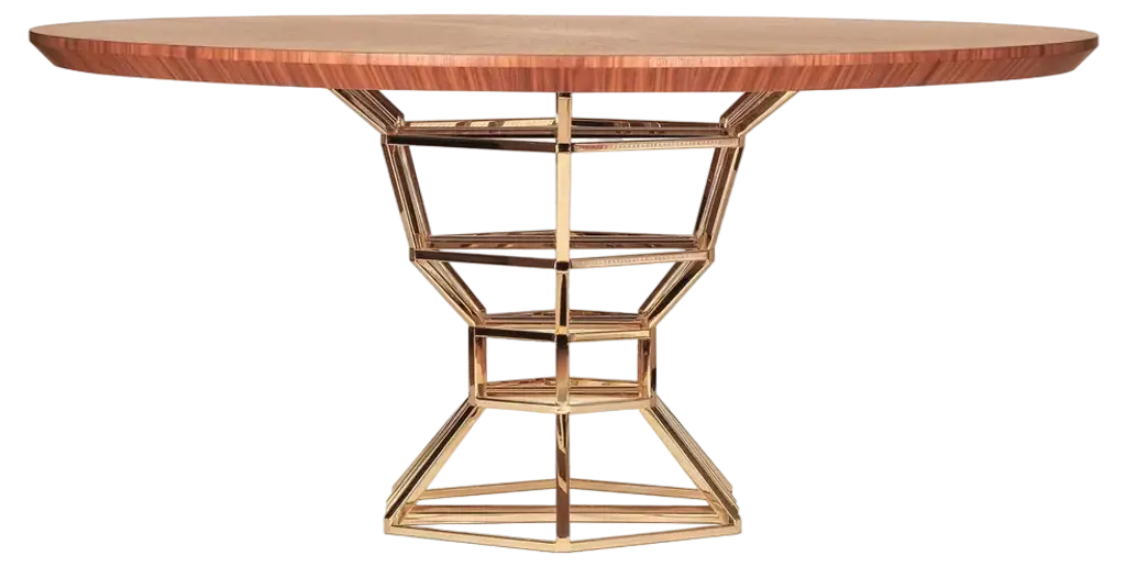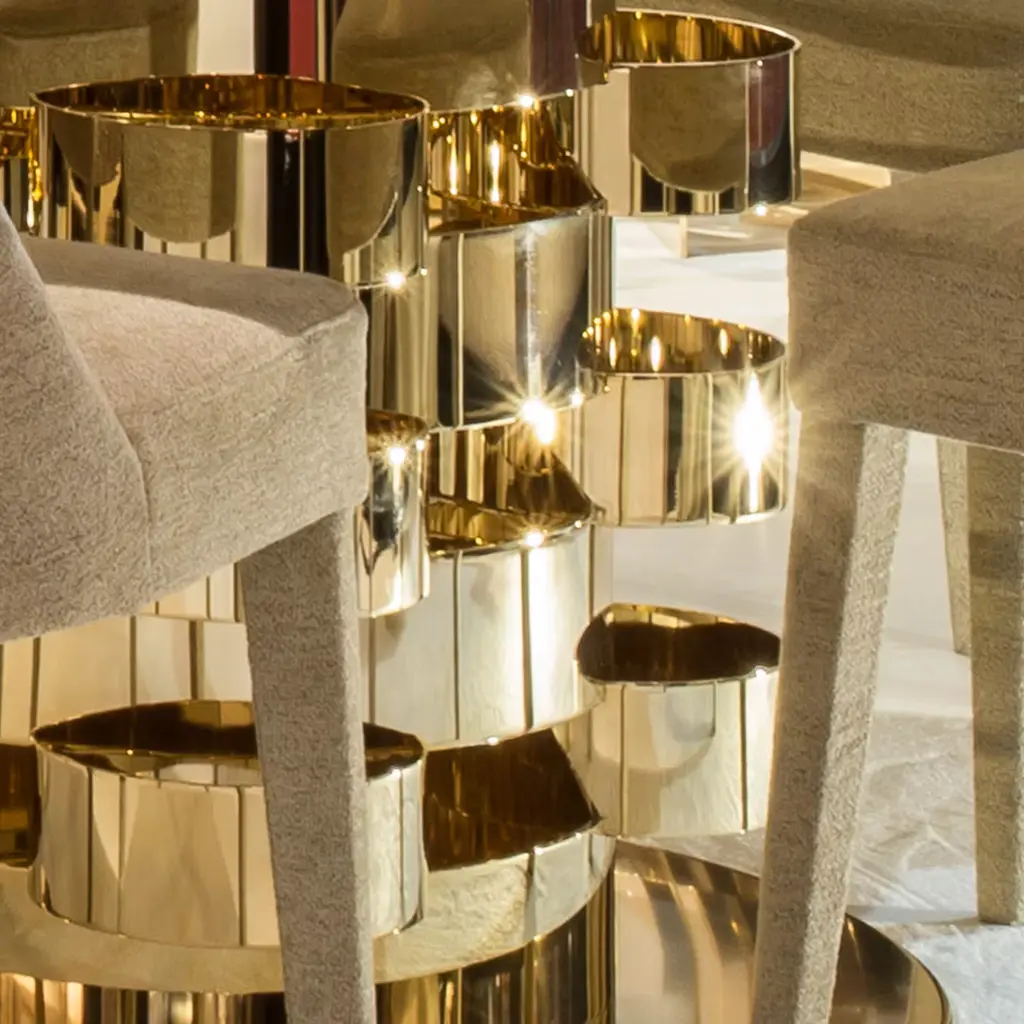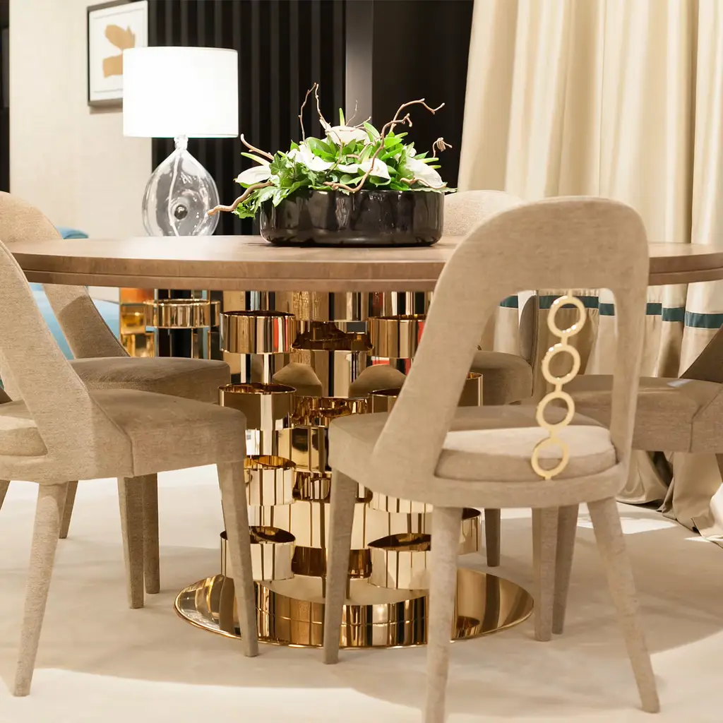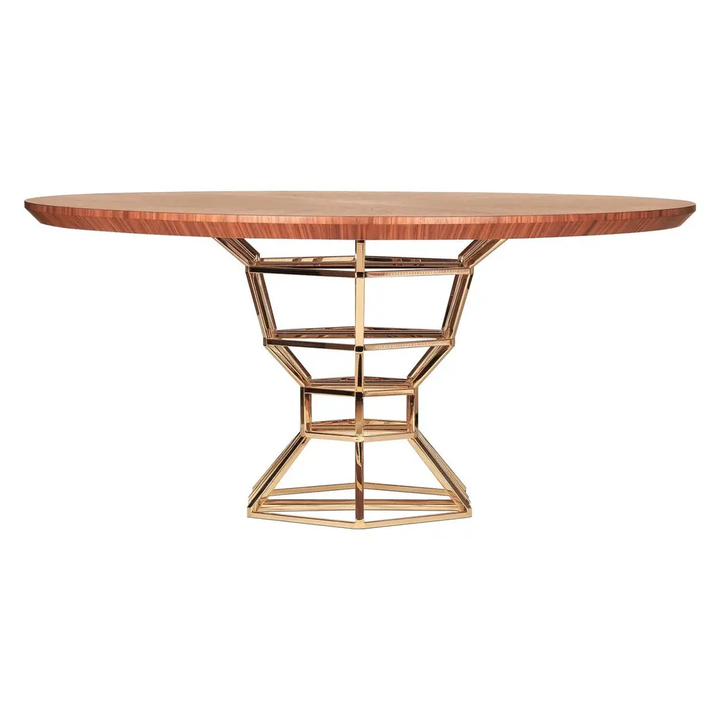 A striking support structure comprising an overlapping of circular, brass-finished metal shapes in different sizes marks this exquisite dining table. The circular, sturdy top in inlaid wood adds an important chromatic contrast to the central column and it could also be requested in other wood finishes and colors, or in beveled glass. A round, thin metal base in the same finish as the support completes this outstanding piece of functional decor. For other finishes and customizations, please ask the Concierge.