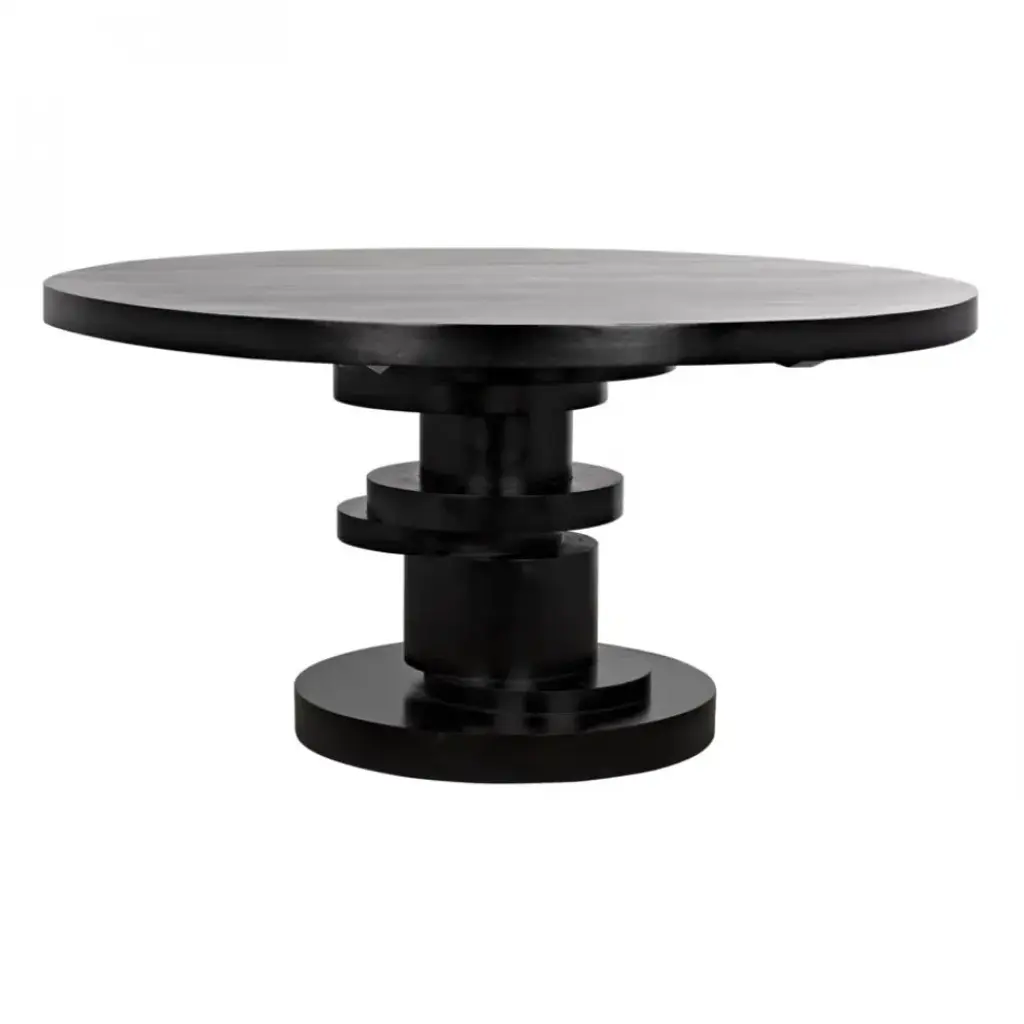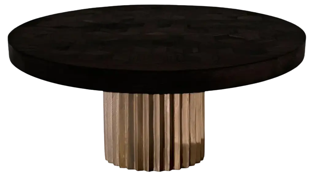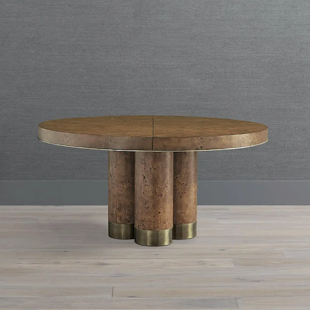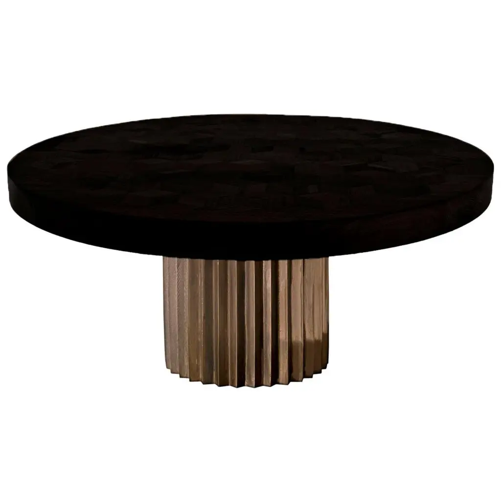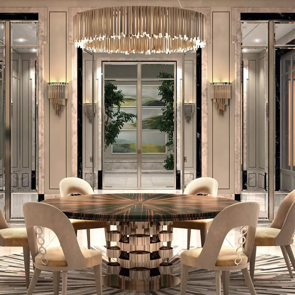 A striking support structure comprising an overlapping of circular, brass-finished metal shapes in different sizes marks this exquisite dining table. The circular, sturdy top in inlaid wood adds an important chromatic contrast to the central column and it could also be requested in other wood finishes and colors, or in beveled glass. A round, thin metal base in the same finish as the support completes this outstanding piece of functional decor. For other finishes and customizations, please ask the Concierge.