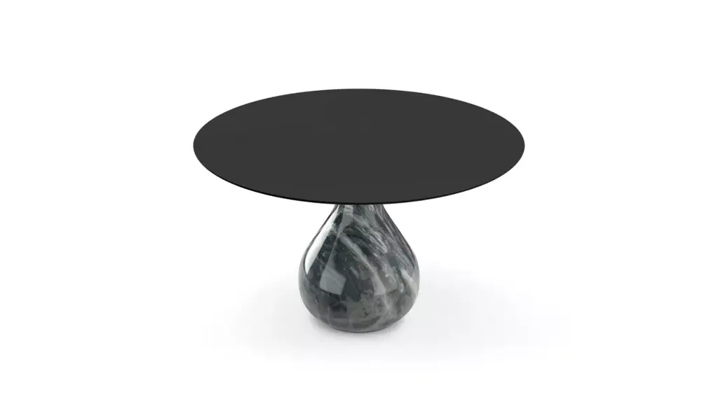 The deceptively simple shape of the Aqua table conceals the incredible craftsmanship that is used to achieve the impressive challenge of designer Fabrice Berrux - making a marble base shaped like a drop of liquid. With the white Carrara or black Marquina marble bases, Aqua can either be monochrome with a color coordinated Fenix-coated top, or contrasting with a black or white top. The Bardiglio gray version is monochromatic but plays on the beautiful warm grey tones of this unique marble. Here, a round dining table in two diameters. The collection also includes a cocktail table and small pedestal tables reminiscent of roly-poly toys.