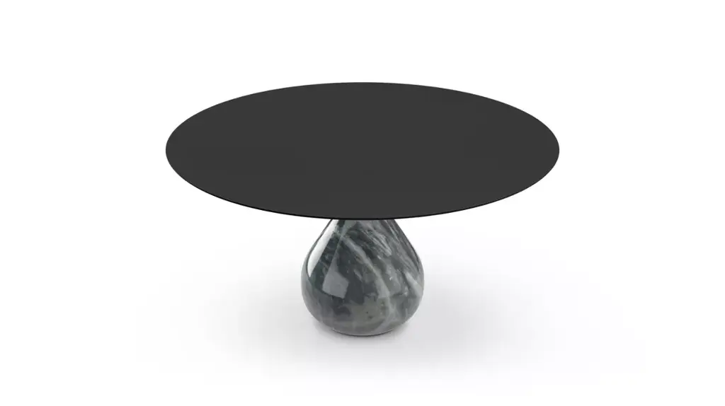 The deceptively simple shape of the Aqua table conceals the incredible craftsmanship that is used to achieve the impressive challenge of designer Fabrice Berrux - making a marble base shaped like a drop of liquid. With the white Carrara or black Marquina marble bases, Aqua can either be monochrome with a color coordinated Fenix-coated top, or contrasting with a black or white top. The Bardiglio gray version is monochromatic but plays on the beautiful warm grey tones of this unique marble. Here, a round dining table in two diameters. The collection also includes a cocktail table and small pedestal tables reminiscent of roly-poly toys.