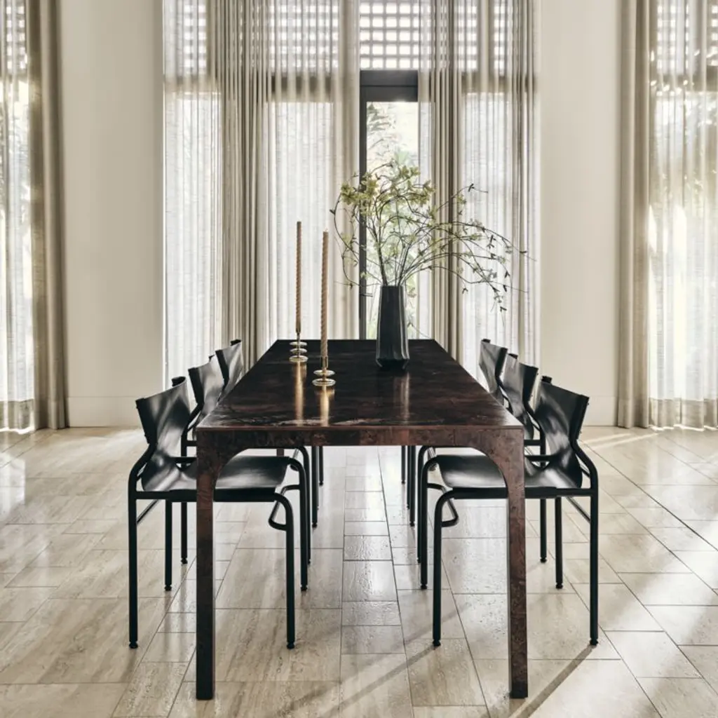 Ancient Roman aqueducts and high-speed trains are the inspiration behind this sleek, lacquered table from Euga Design Studio in Italy. Table flows continuously in a dark Mappa burl wood veneer that nods to a vintage era. Fluid curve of each leg mirrors the sweeping, arched structure of the aqueductsan architectural foundation for a stretch of Eurail tracks. Comfortably dines eight, but will accommodate ten. CB2 exclusive.