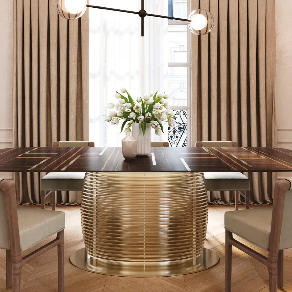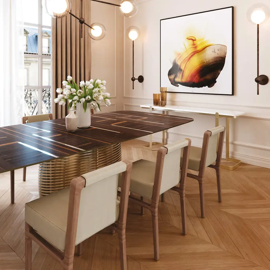 A superlative accent to a refined contemporary interior, this dining table is crafted with passionate care for details. The sleek, rectangular top with rounded edges is fashioned of wengé durmast decorated with an abstract geometric inlaid work of architectural value. The base, also fashioned of wood, features a metallic champagne finish, and is also available with a leather upholstery. Customizable in a round Lazy Susan version. Please consult the Concierge for more customization options.