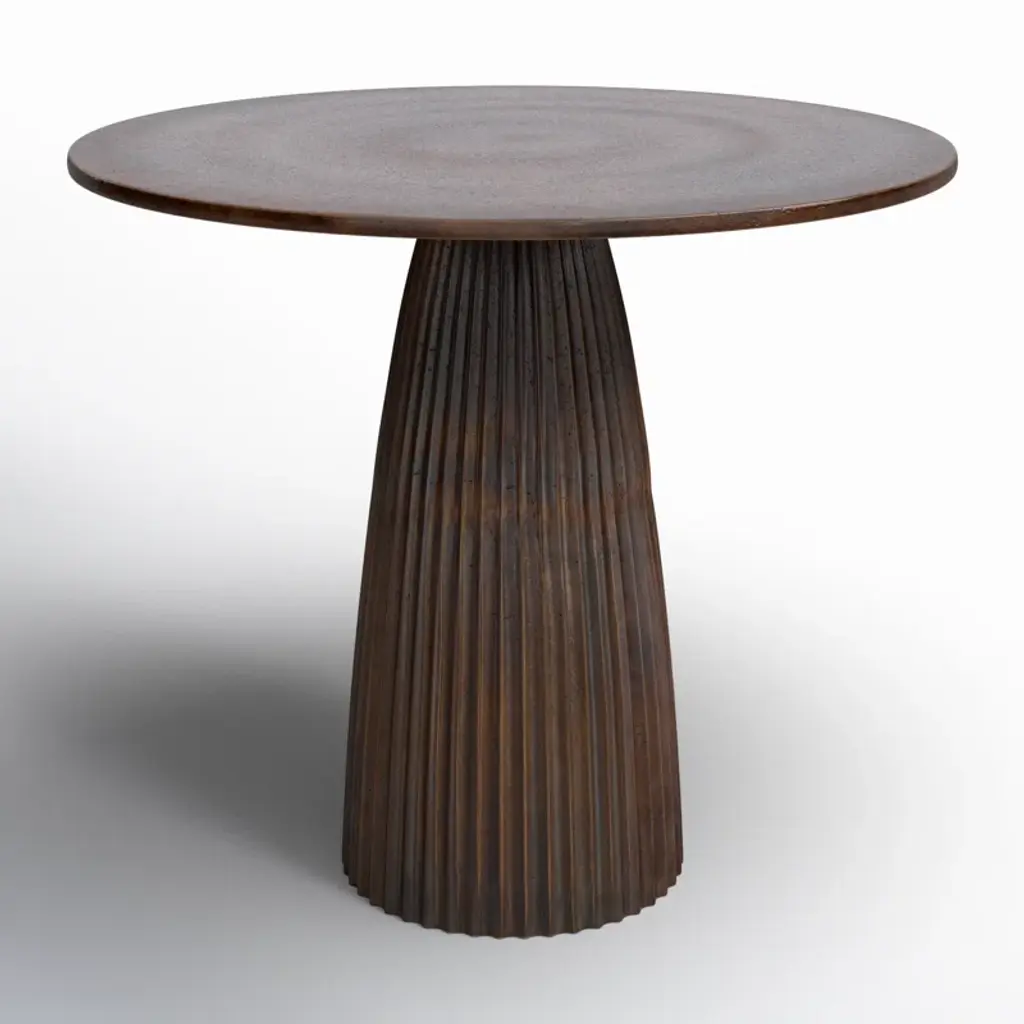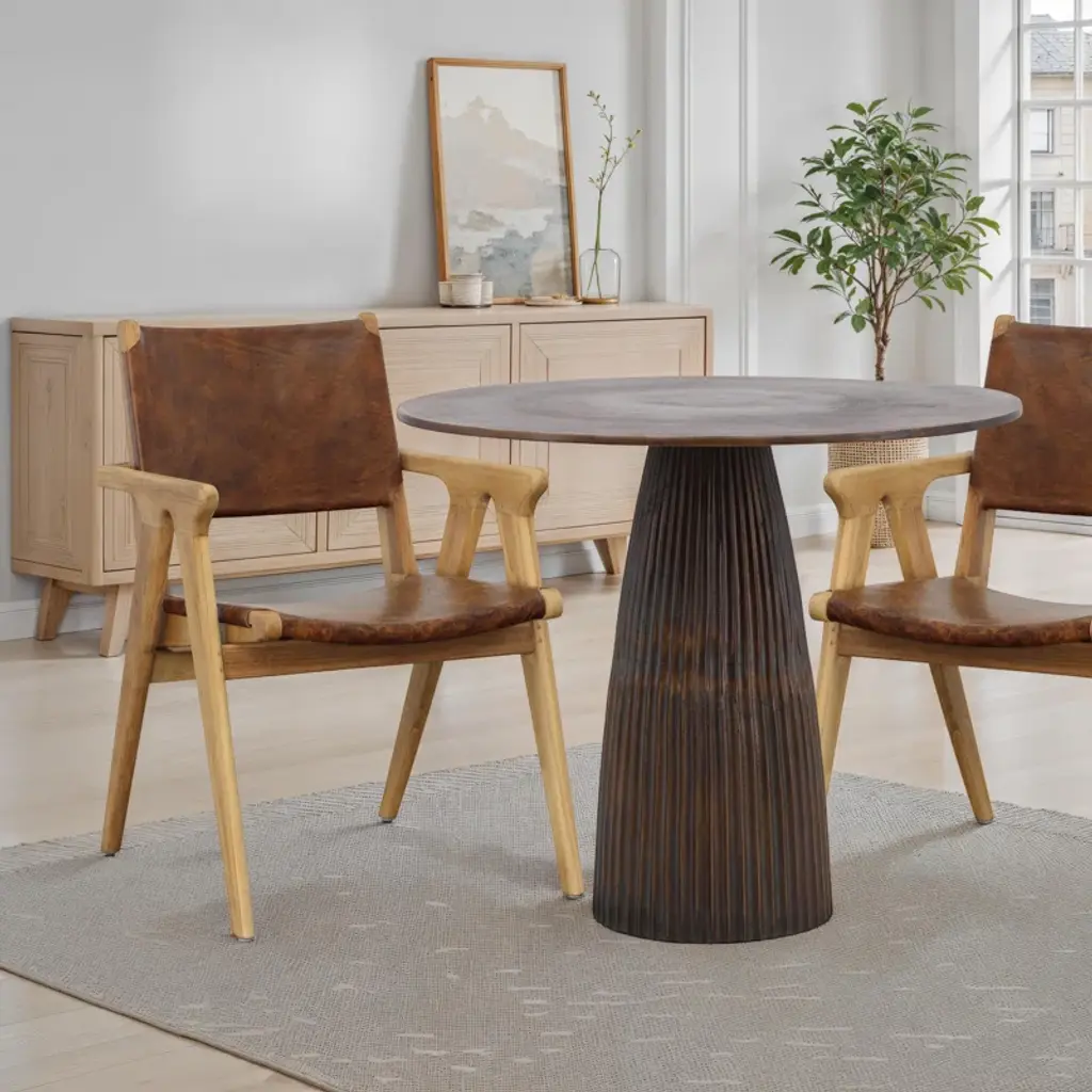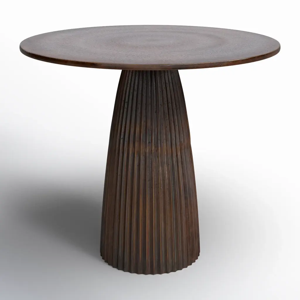 This dining table is where timeless design meets modern craftsmanship. With its round aluminum top and pedestal base, it offers a sleek and versatile look that fits effortlessly into any dining space. The distressed metal finish, featuring coat and paint distressing, adds a touch of character and charm.