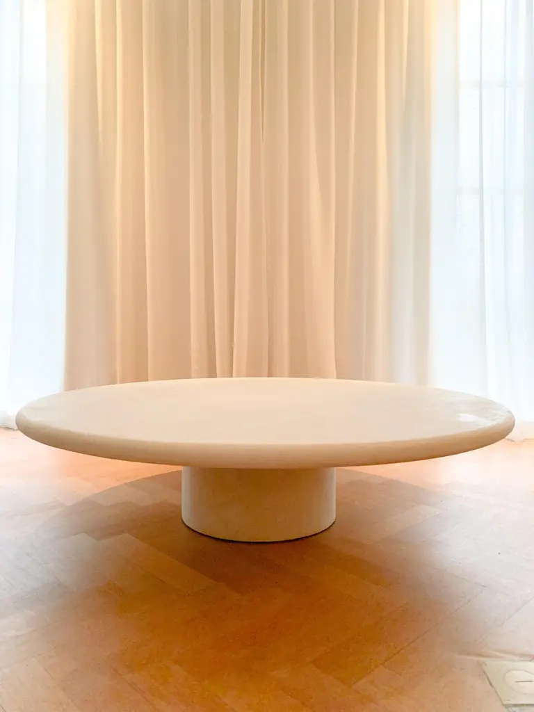 Arata Low Table by KasanaiDimensions: D 120 x W 120 x H 30 cm.Materials: Lime plaster.Also available in different dimensions and colors. Please contact us.Eternal in its appeal and refined in design, this captivating coffee table effortlessly becomes the focal point of your living space. Perfectly proportioned, it provides a platform for your favorite decor pieces or a gathering spot for cherished conversations. Revel in the enduring charm of Arata, where every cup shared is accompanied by the rich narrative of its unique craftsmanship. truly exceptional addition to your living space. Also avaible as dining table.KASANAI was founded in 2021 by interior designer Virginie Steeland. Inspired by the complexity of finding minimal yet refined pieces for her own home, she decided to create her own.Believing strongly in the role interior design plays in mindful beings, we used the principles of minimalism to create objects that are timeless and durable. Shying away from the throw-away culture we strongly believe in investing in high-quality pieces that make your home a peaceful environment. We’d like to inspire you to contribute to a slow-living kind of mindset where less is always more and every piece is seen as an investment. Something that outlives trends and can be enjoyed for many years to come.