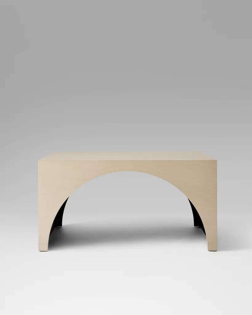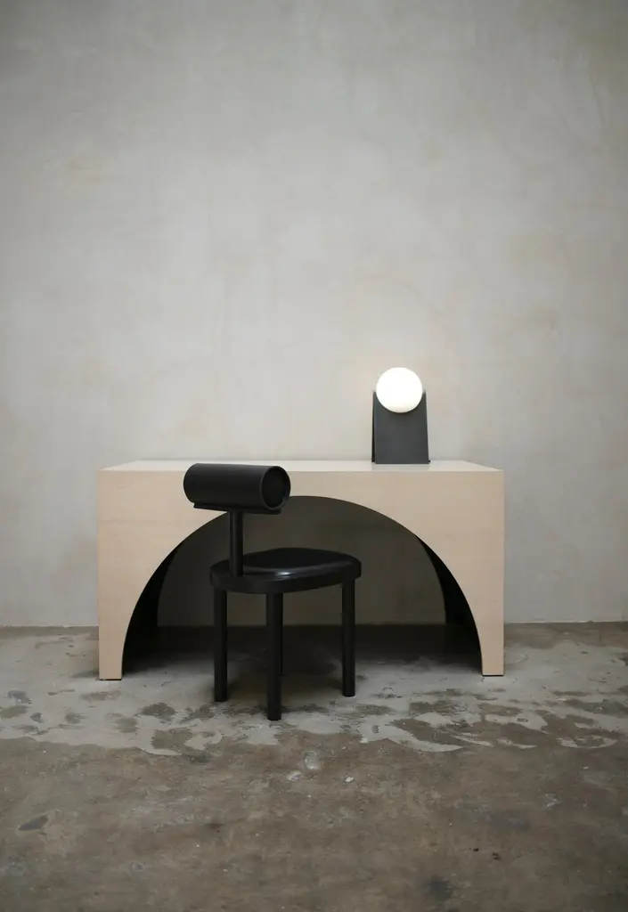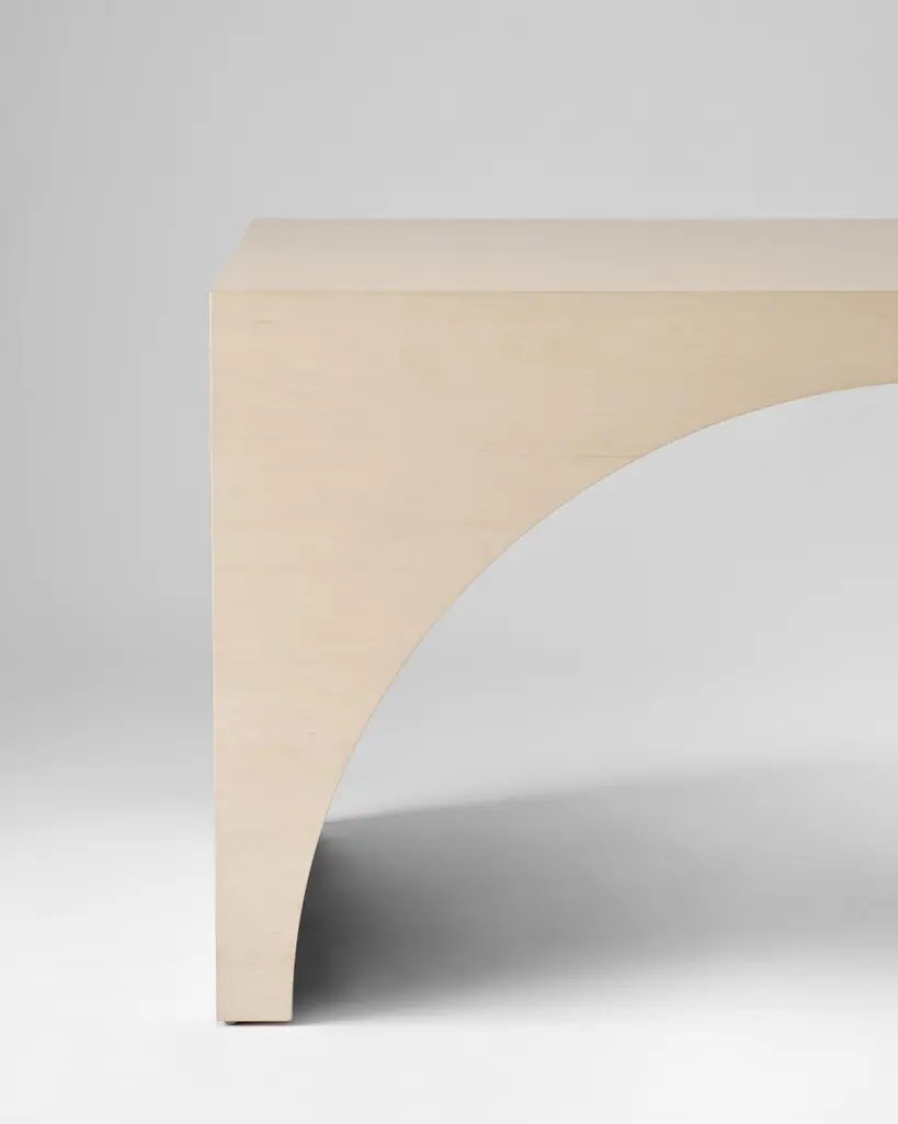 Arc desk made from wood with a bleached maple veneer finish and black stained interior.Can also be used as a small dining table or wide console.Designed and handmade in Los Angeles by Estudio Persona.
