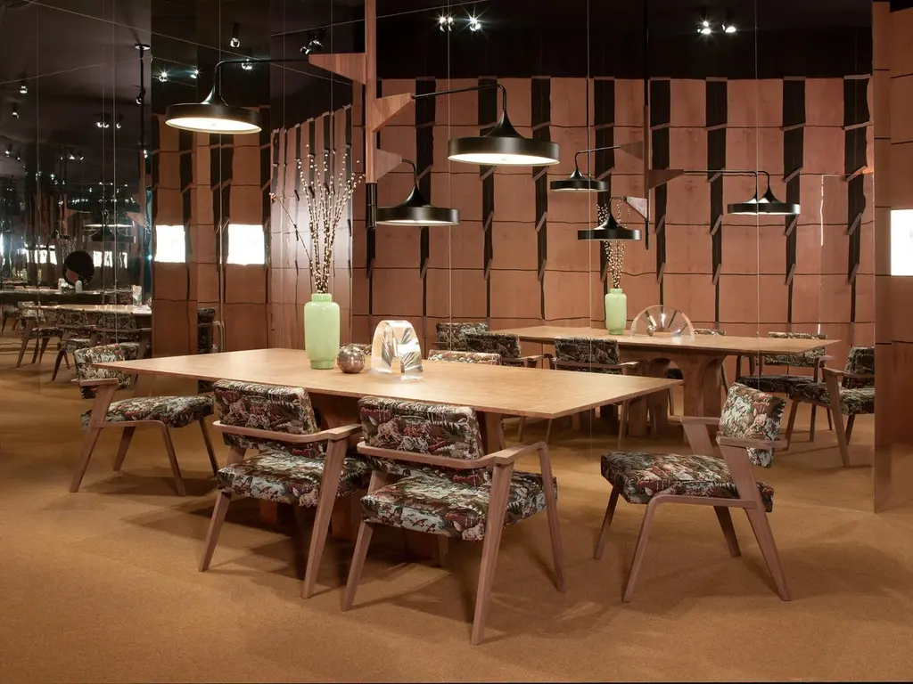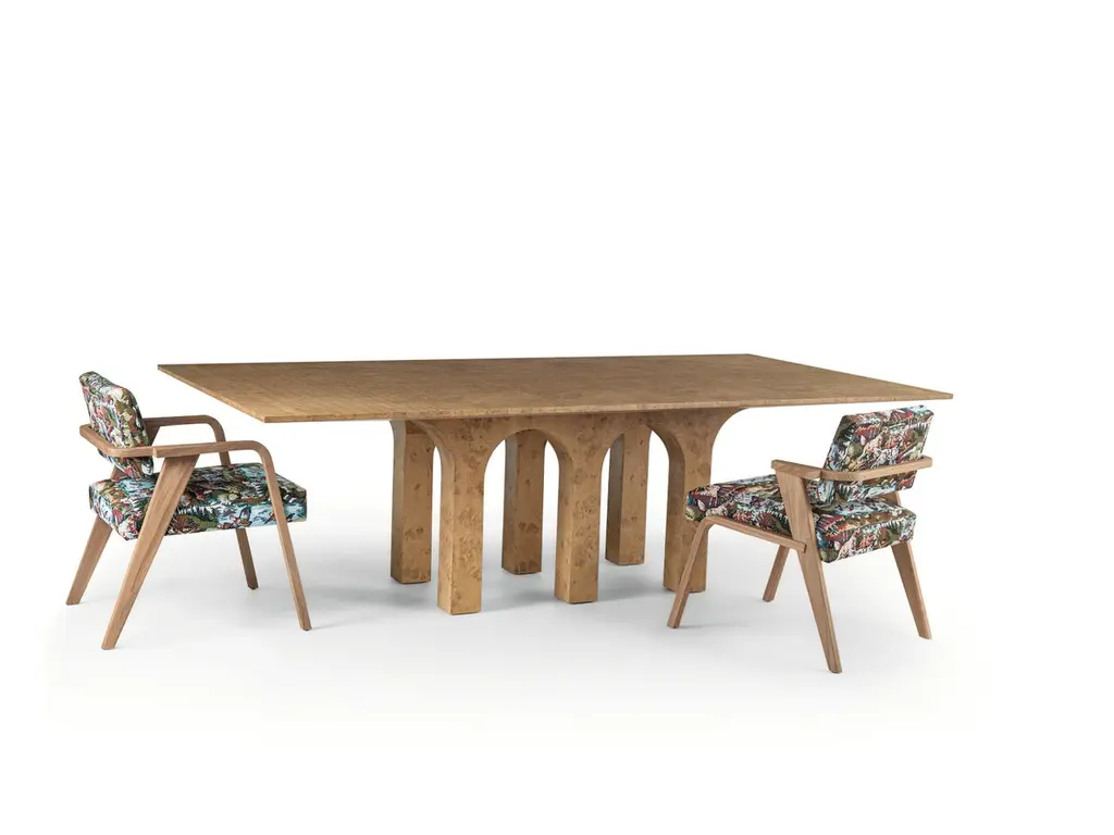 This table is a monumental piece covered entirely in inlaid oak root, born from the fusion of classic architectural forms of arches and cross vaults and the tradition of noble cabinetmaking workmanship.The base is composed of six legs that draw a series of arches, not only serving the function of supporting the top but also becoming an allusion to past eras: a microarchitecture in the product itself.The geometrically austere rectangular top is embellished with a hammered inlay in black ebony that mimics the design of the architectural base in two dimensions.Archi as a whole is a tribute to the culture of design and wisdom of Italian manufacturing, where ideas merge with technique as a testimony to the unique mastery typical of our heritage. An authentic blend of craftsmanship and design, Archi is not just a piece of furniture but a celebration of Italian architecture in miniature form, overcoming the simple functionality of the object and becoming a symbol of beauty and historical memory. A real tribute to the excellence of Italian design, capable of transforming everyday life into the extraordinary.