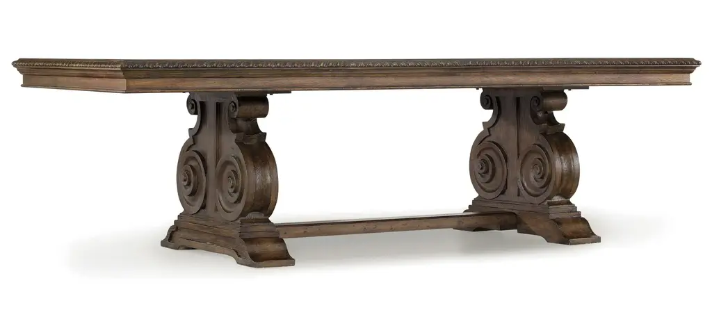 Inspired by French antiques and influenced by classic farmhouse design, the Archivist Trestle Table is an inviting gathering table for welcoming family and friends alike. With two 18-inch leaves, the table extends to 122 inches long to accommodate two armchairs and six side chairs for large gatherings. Without the leaves, the table will accommodate two armchairs and four side chairs.
