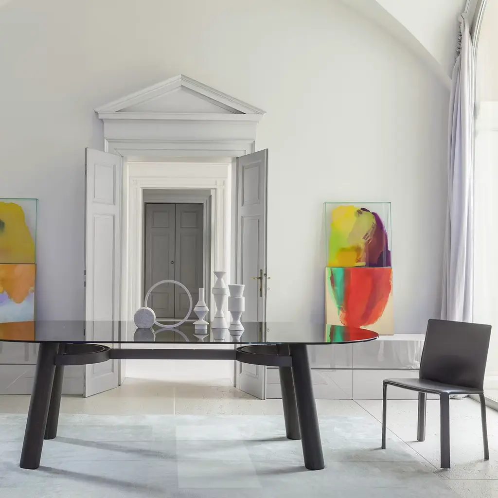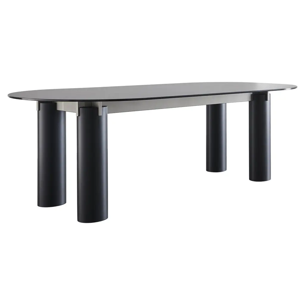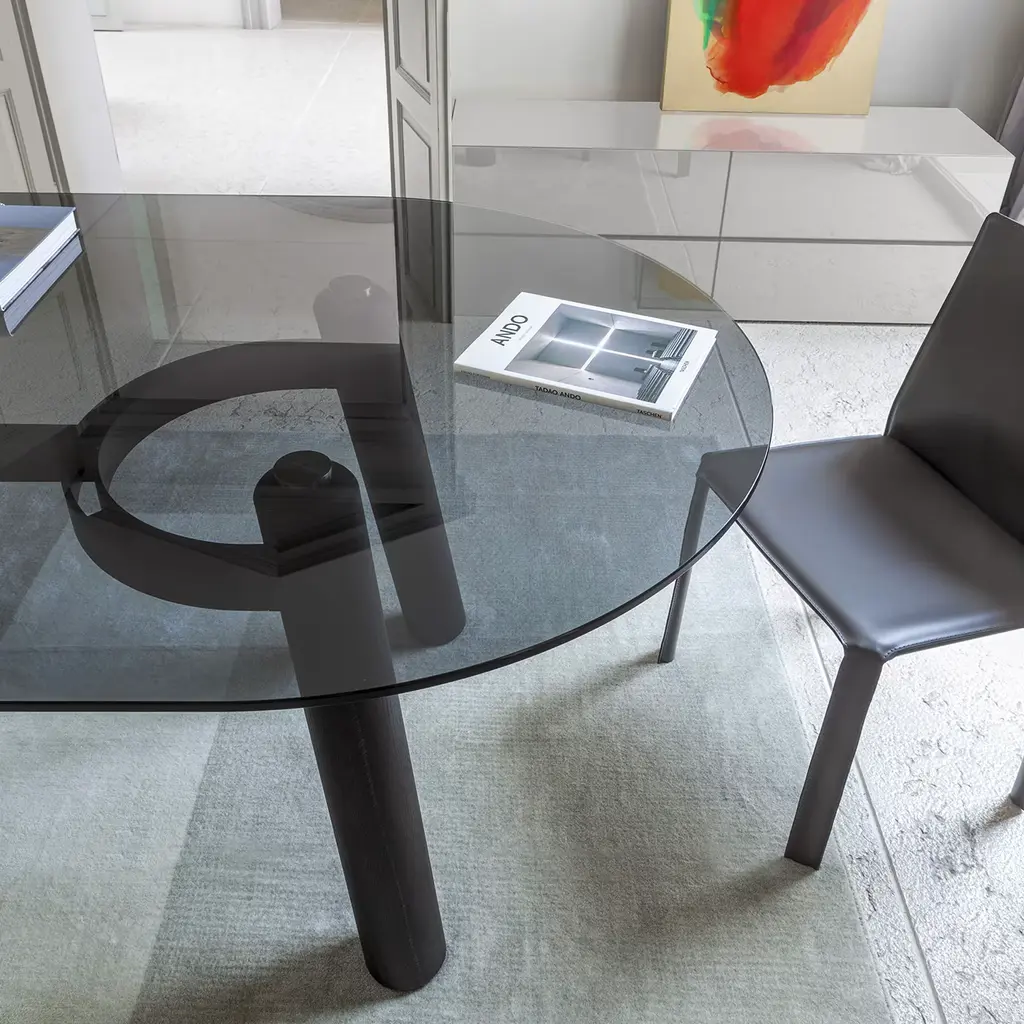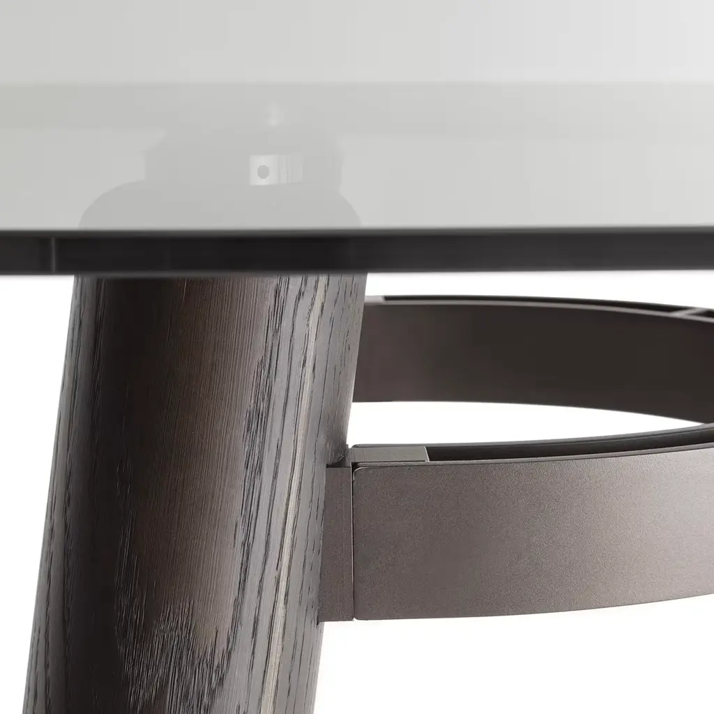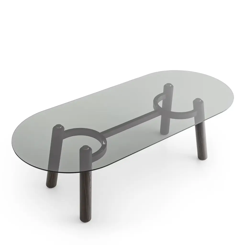 Turned legs in solid oak offered in a deep Laguna finish immediately channel the bold charm of this modern-style table. Ideally complementing exclusive dining rooms, its convivial spirit seems confirmed by the rounded shape of its elongated 12mm-thick smoky glass top, which reveals the arc-shaped elements of the burnished rolled metal structure - varnished with epoxy powders - reinforcing the base.
