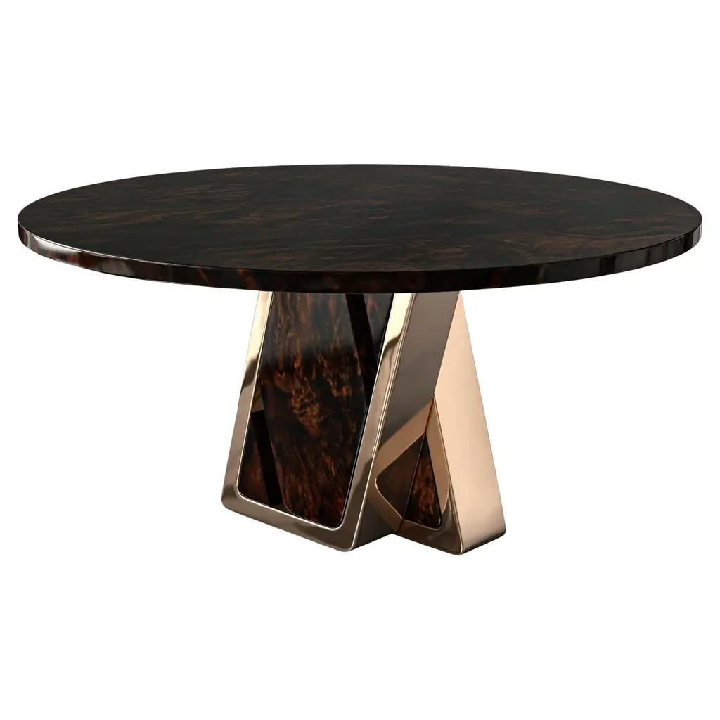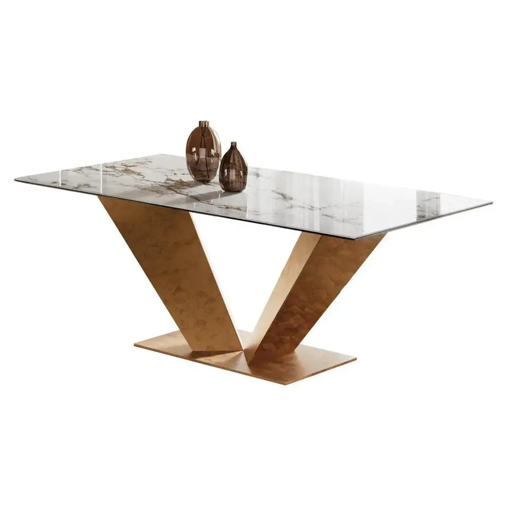 Ares Dining Table by Chinellato Design Dimensions: W 250 x D 120 x H 72 cm Materials: Top: Capraia glossy Ceramic top and an Extra Clear Tempered Glass under-top. Base: Large Piece Copper Leaf finish. Ares, a rectangular dining table available in three sizes, offered with three combinations of base and Top finishes. The base, crafted from worked and welded steel, is available in Large Silver Leaf Pieces, Large Gold Leaf Pieces, and Large Copper Leaf Pieces finishes. Tops are available in Smooth Smoked Tempered Glass, Glossy Capraia Ceramic, and Glossy Heritage Azzurro Ceramic.