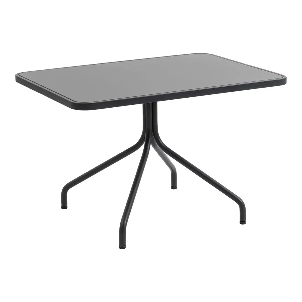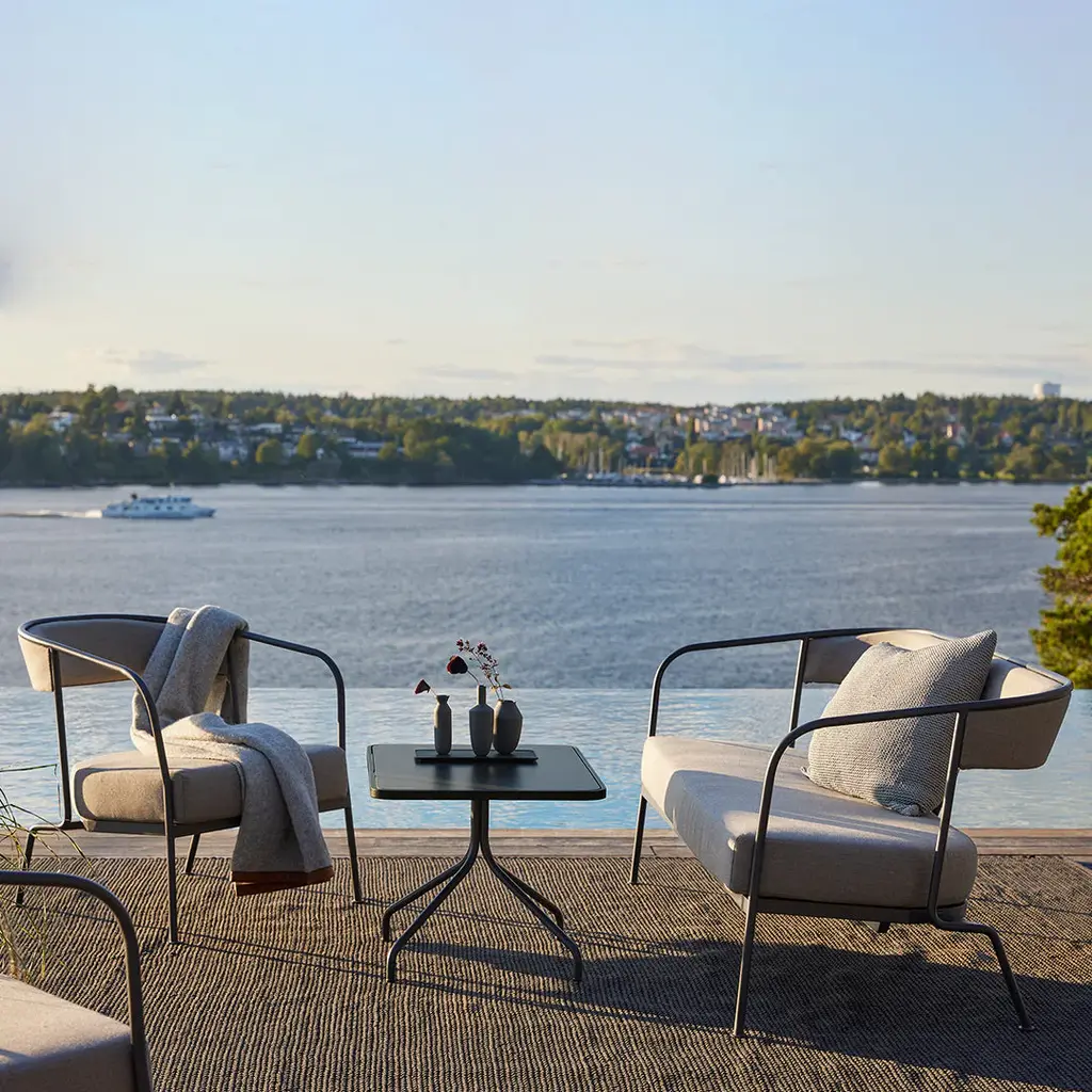 A minimalistic lounge table made of powder coated aluminum with a composite tabletop. Arholma is a minimalistic collection of outdoor dining and lounge furniture. The collection is crafted in a galvanized powder-coated aluminum frame with durable outdoor fabric that withstands even the toughest of climates. Sustainability, in all aspects of the word, is at its core. It's durable, resilient and resource-smart. It looks contemporary by being timeless, this means it's unlikely that Arholma will ever become outdated. Inspiration for the collection and its name comes from Arholma, an island in the Stockholm archipelago with a secret defense facility hidden inside its cavernous rocks. Products designed for military use are resource-efficient, have long lifespans, and have a simplicity that comes from a clearly defined function, be it a Jeep or an M65 jacket. The Arholma collection is that. This furniture can be seen on the deck of a destroyer, in grey camouflage, by a pool or outside an ice cream stall in Vienna, on the gravel, under the oak trees.