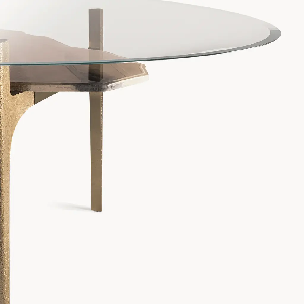 The Arkady dining table features a base crafted from cast aluminum and steel, combining durability with refined design. The four legs, finished in a hand-polished hammered gold texture, connect seamlessly to a supporting frame. This structure supports an undertop in hand-worked beige marble, adorned with an elegant mineral-patterned bas-relief. The top is made of extra-clear tempered glass with a beveled edge, offering a sophisticated and luxurious touch to this exceptional design piece.