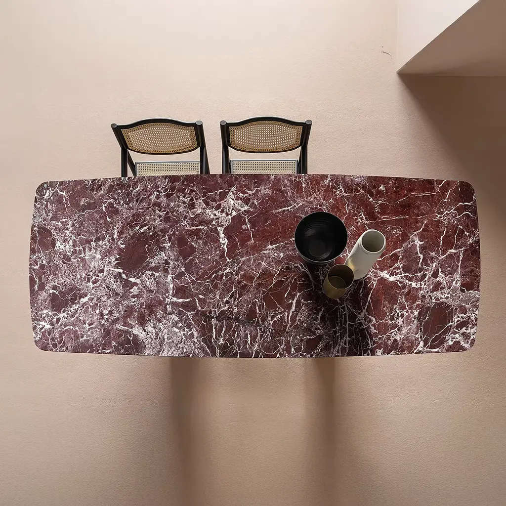 The striking table features a Red Lepanto marble top with rounded edges, exuding luxury and elegance. The oval legs are finished in high-gloss Burgundy lacquer, complementing the rich marble surface. Crafted from curved plywood and poplar plywood, the base adds both stability and style. A perfect blend of classic and contemporary design, it is ideal for adding a bold statement to any modern spaces.