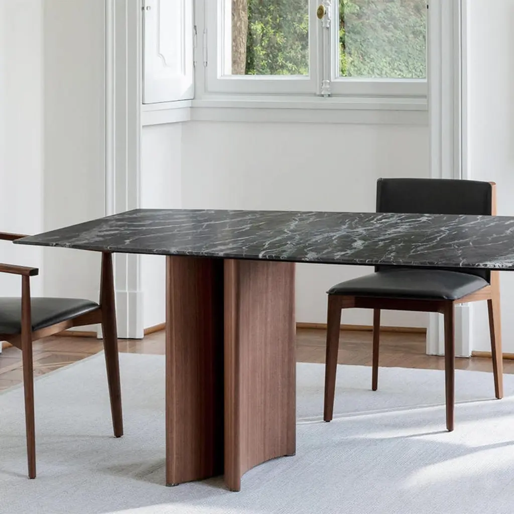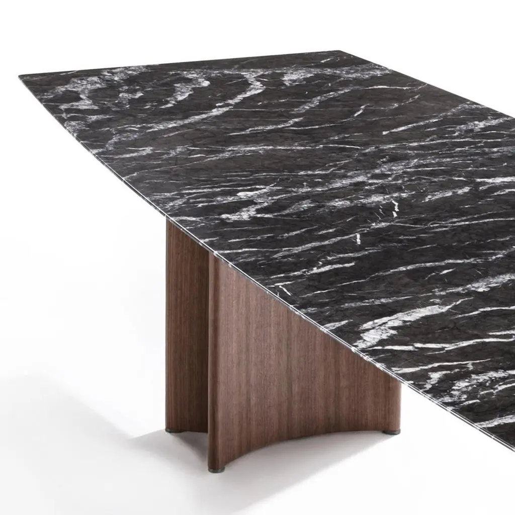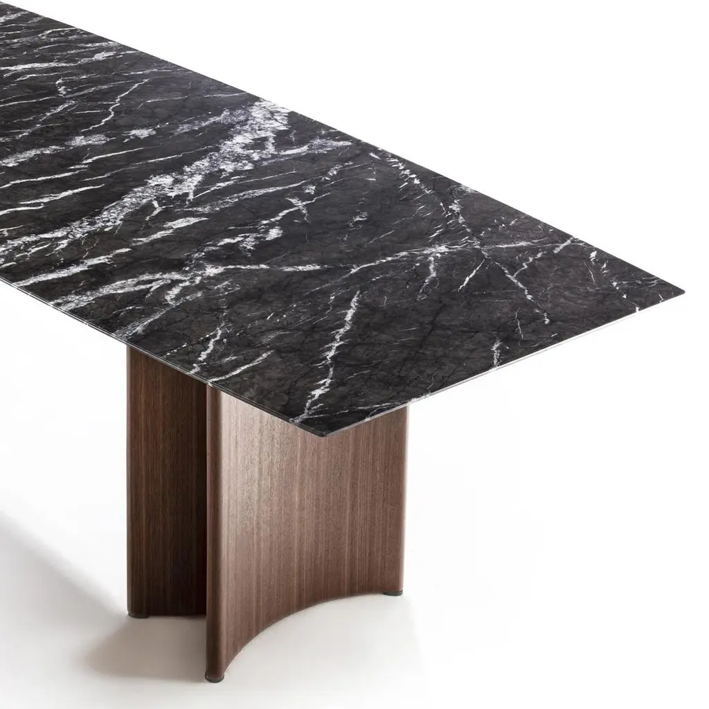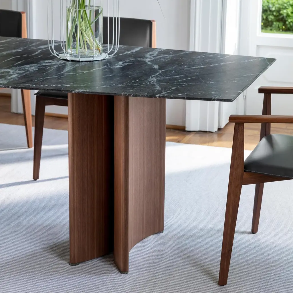 Dining table around marble with 2 curved solid walnut bases each sides with metal end-feet. With curved shaped polished dark grey marble top (20mm thickness).Marble top with bevelled outline edge.Also available on request with calacatta white marble top oremperador marble top or sahara black marble top, including up-charge.Also available on request in: L240xD110xH74cm, price: 29900,00€L220xD110xH74cm, price: 28900,00€.