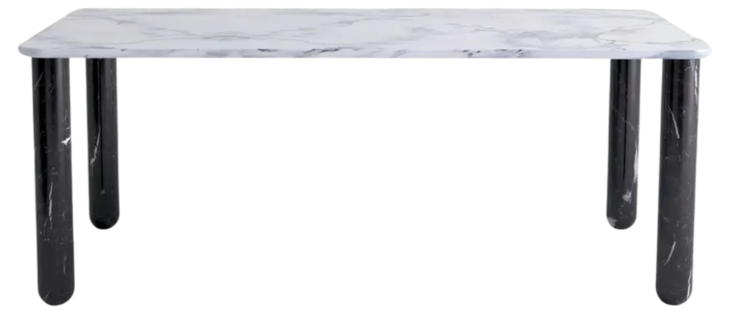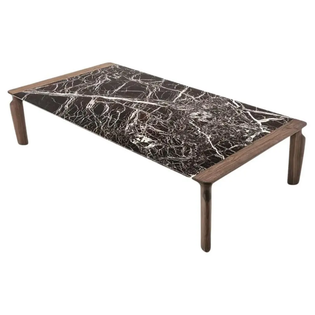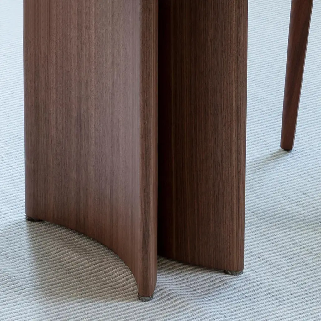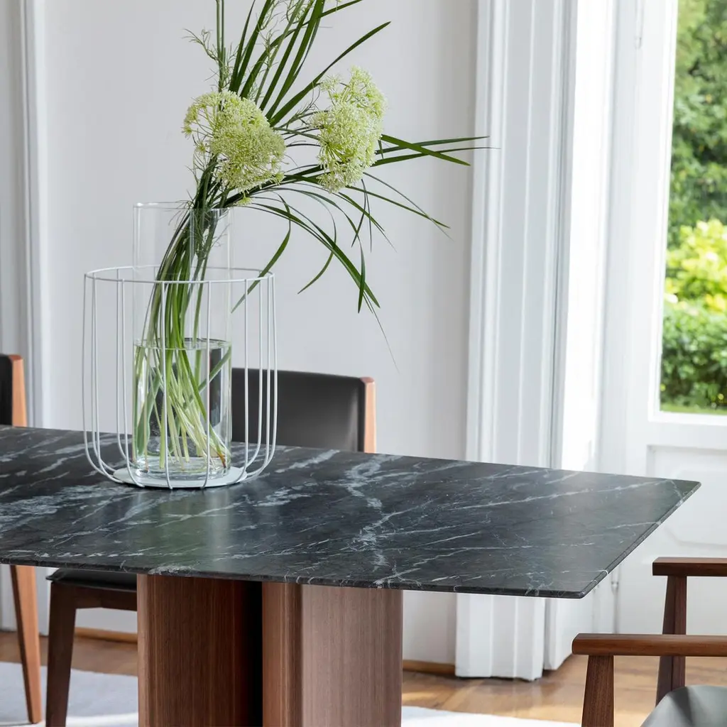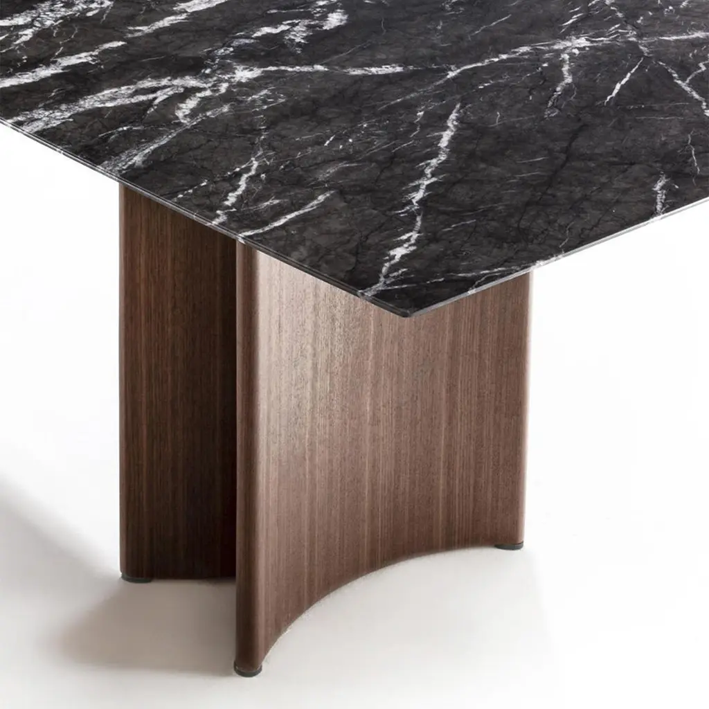 Dining table around marble with 2 curved solid walnut bases each sides with metal end-feet. With curved shaped polished dark grey marble top (20mm thickness).Marble top with bevelled outline edge.Also available on request with calacatta white marble top oremperador marble top or sahara black marble top, including up-charge.Also available on request in: L240xD110xH74cm, price: 29900,00€L220xD110xH74cm, price: 28900,00€.