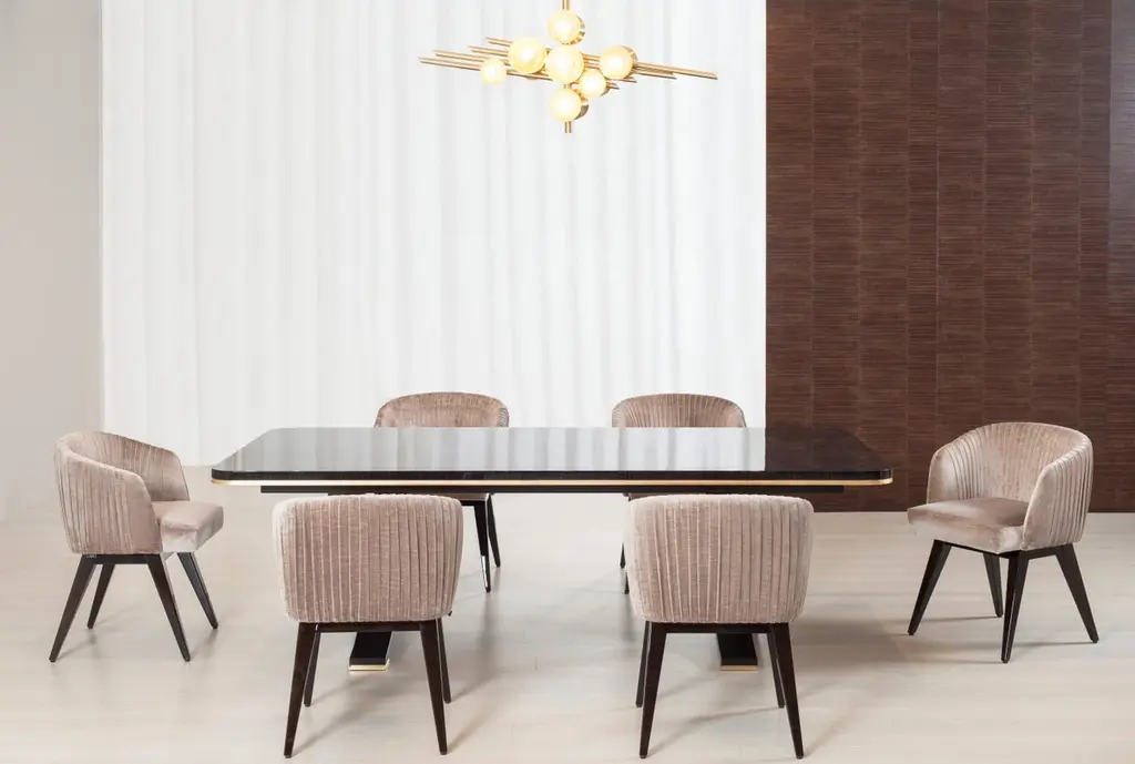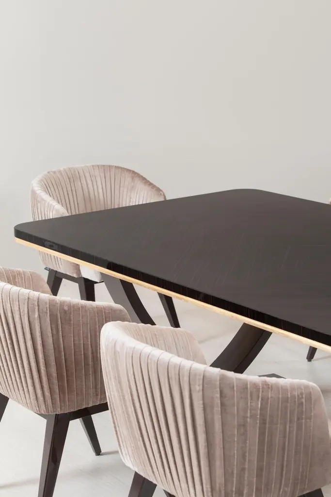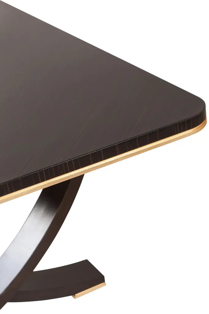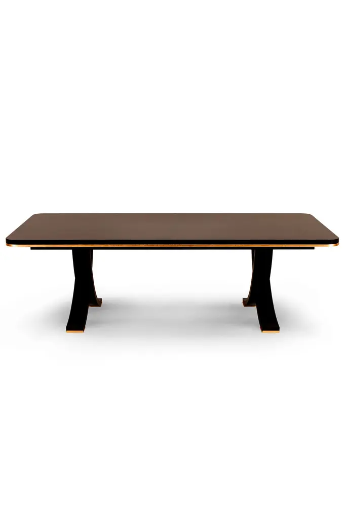 Charles dining table, Modern Collection, Handcrafted in Portugal - Europe by GF Modern.A flowing design with refined details. Charles offers the right combination of materials for any modern interior.The table top in macassar ebony veneer complements the arched legs in dark brown stained solid beech. The inlays on the tabletop and the hand-applied gold leaf gilding on the legs are the ultimate form of sophistication.Charles 8-Seat Dining Table Material CodesWD099 Macassar ebony pré-composite; natural colour; high-gloss finishFI094 Gold leaf; satin finishWD066 Beech; dark brown stained; high-gloss finishLimited Edition. Signed and Numbered.Handcrafted in Portugal - Europe by GreenappleUnique by design, Crafted by peopleFounded in 2005 by Sérgio Rebola and Rute Martins, Greenapple designs and produces in-house luxury furniture for exclusive customers worldwide.Our own in-house production facility allows us to be obsessed with detail, and gives us the freedom to dedicate ourselves to the most demanding tailor-made and customised work. As Rute designs all the unique pieces, Sérgio assures the high-quality standards through the whole process - from design to production; from production to your home. Fine craftsmanship, whether perfected by experienced hands or state-of-the-art machinery is quintessential in delivering top quality experiences.