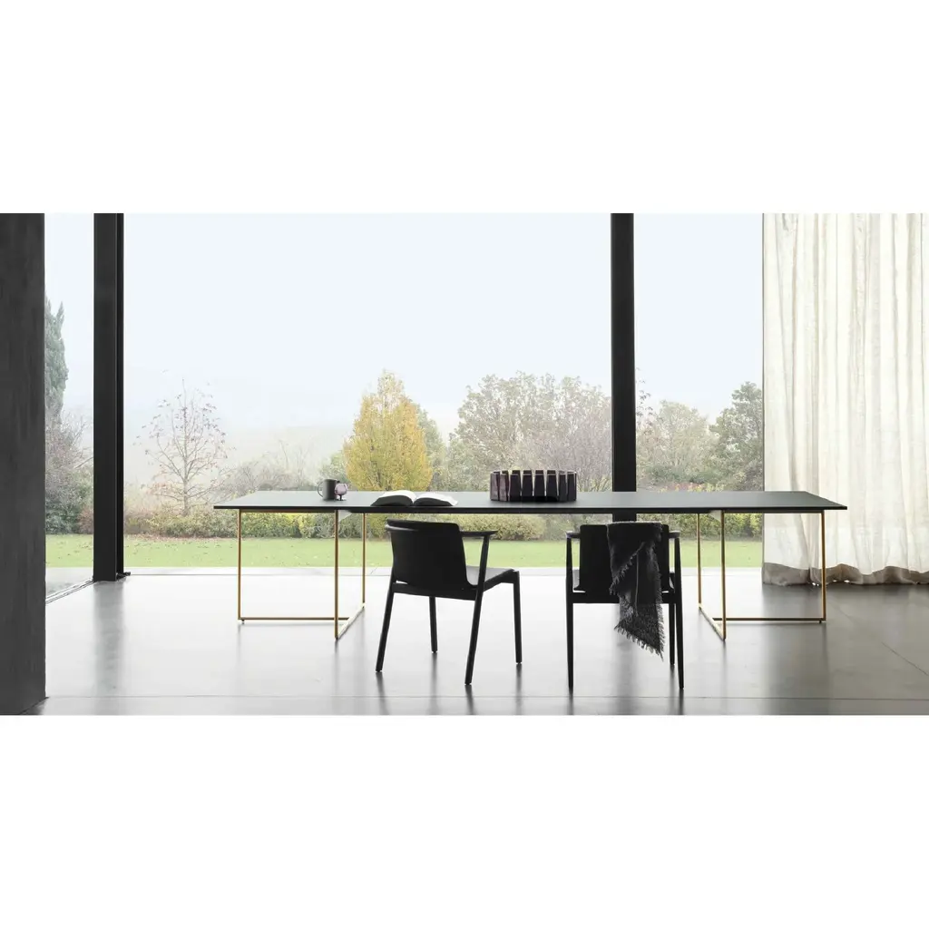 The Art Deco Rectangular Dining Table by Lema Alamo offers a new take on the 1940s decorative style, combining a minimalist, contemporary approach with some bold, sophisticated lines. The key theme here is the one of lightness. The tabletop and structure have been made as slender as possible, creating an elegant and clean piece whose combination of different materials ensures its success. The structure - in bronze-painted metal - supports a top in aluminum laminate with a unique mosaic-effect finish created using reconstructed marble. Exclusive to Lema, the mosaic-effect finish is made from resin, pigmented marble dust, and fragments of metals such as brass and bronze and is available in three versions, all inspired by precious natural stone: Blu Lapislazzuli, Verde Malachite, and Nero Belgian Blue. The table top is also available in heat-treated oak.