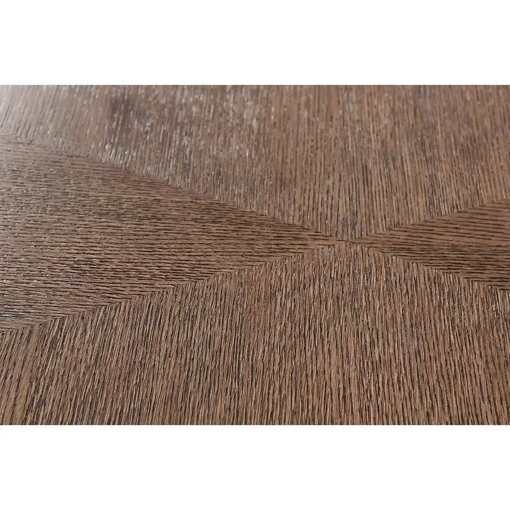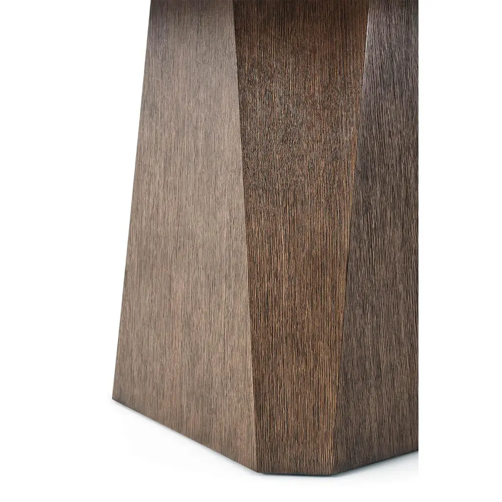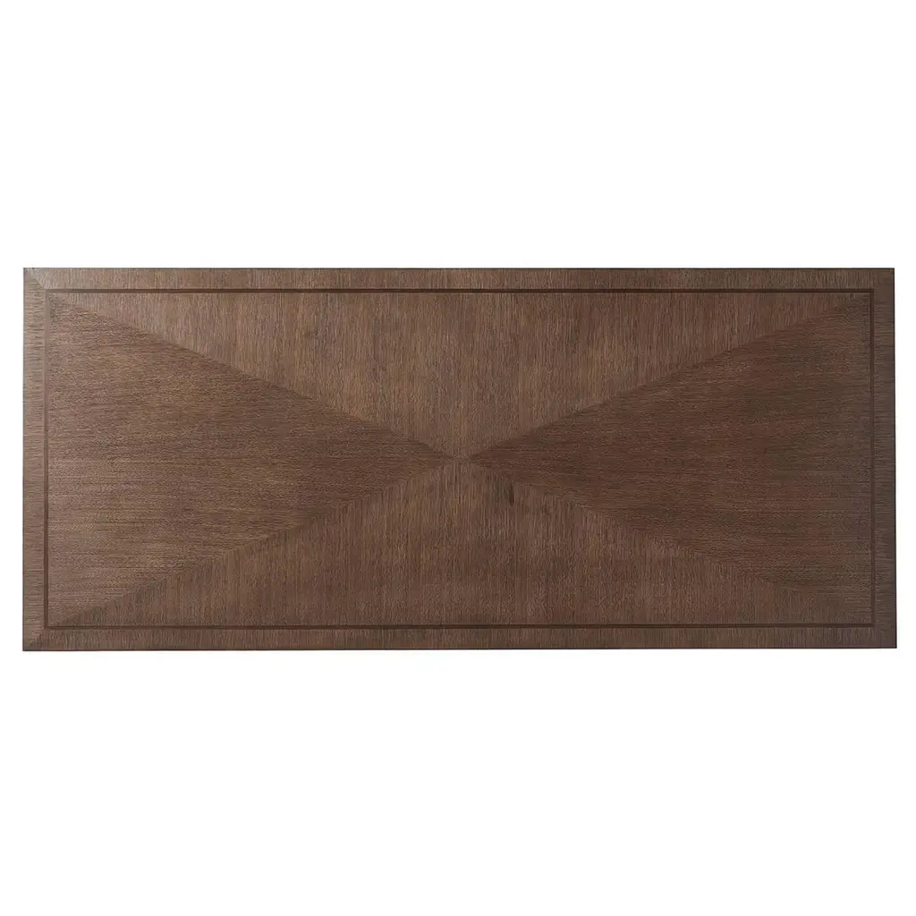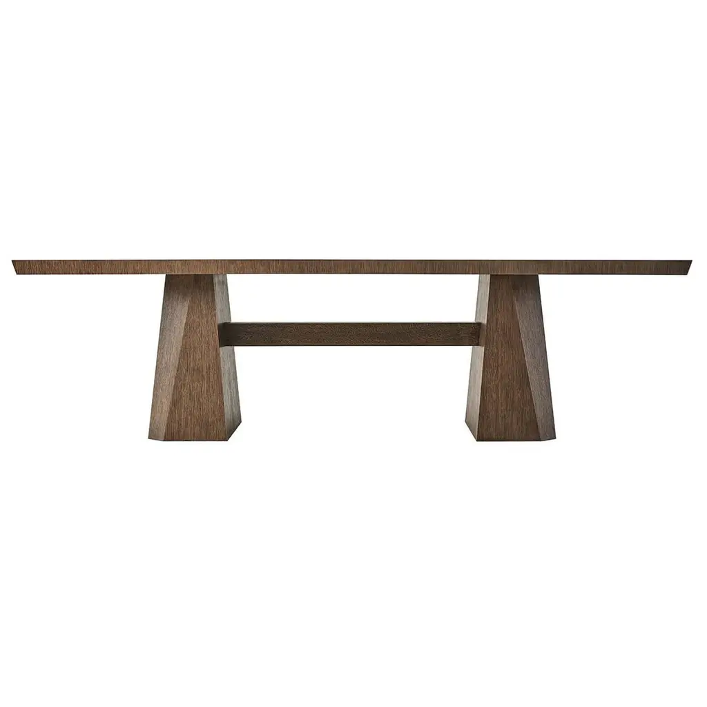 Art Deco style dining table with a brushed quarter oak veneered top with walnut banding and with canted corners on twin tapered geometric pedestal bases and a bold stretcher.Dimensions: 105" W x 46" D x 30" H.