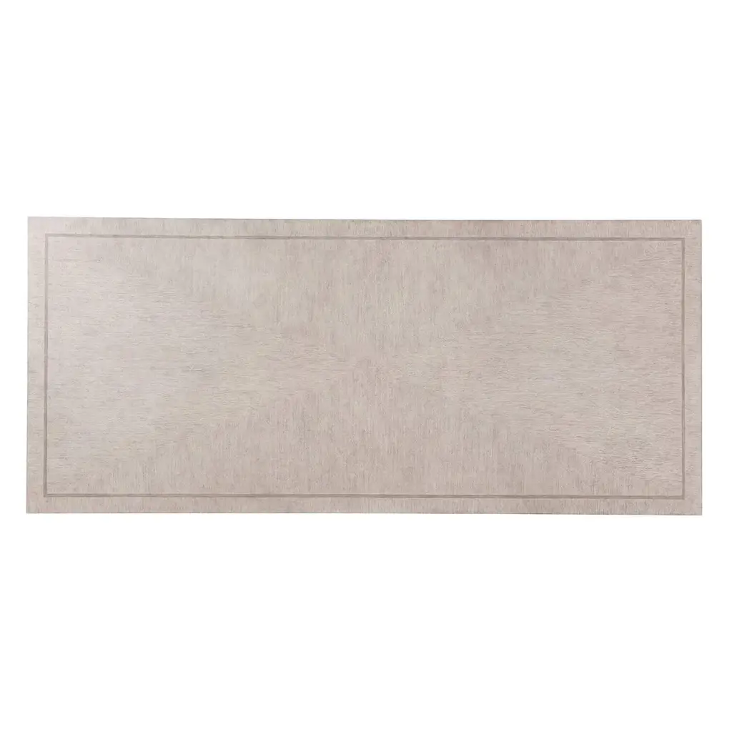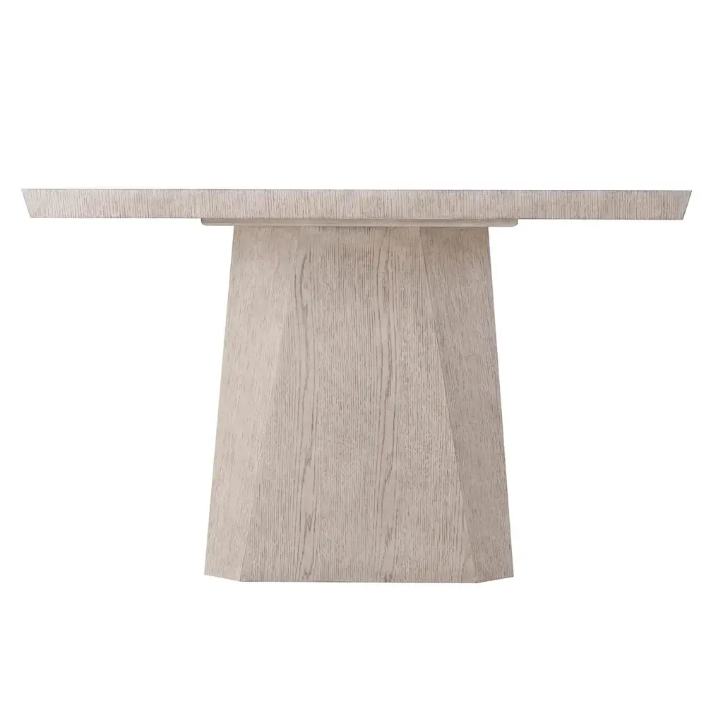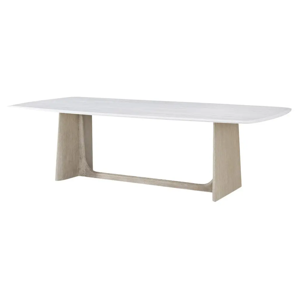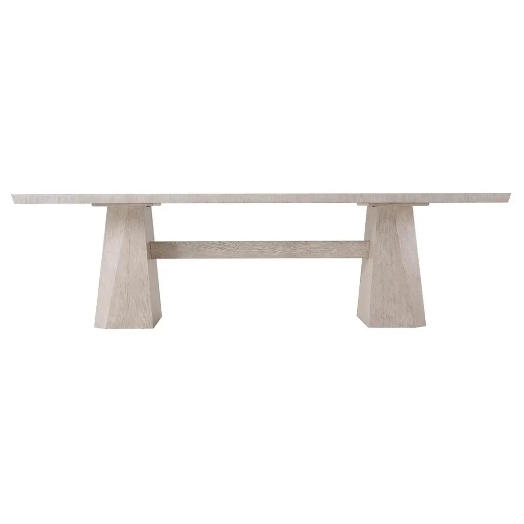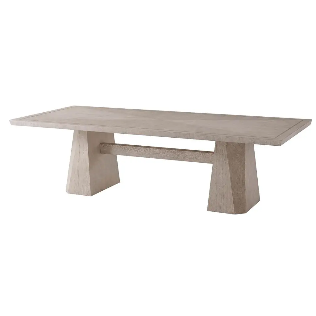 Art Deco style dining table with a light brushed quarter oak veneered top with walnut banding and with canted corners on twin tapered geometric pedestal bases and a bold stretcher. Dimensions: 105" W x 46" D x 30" H