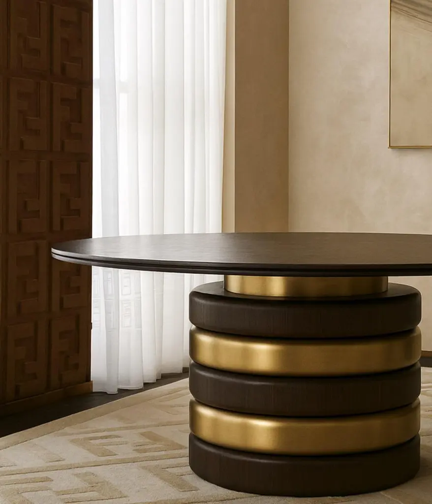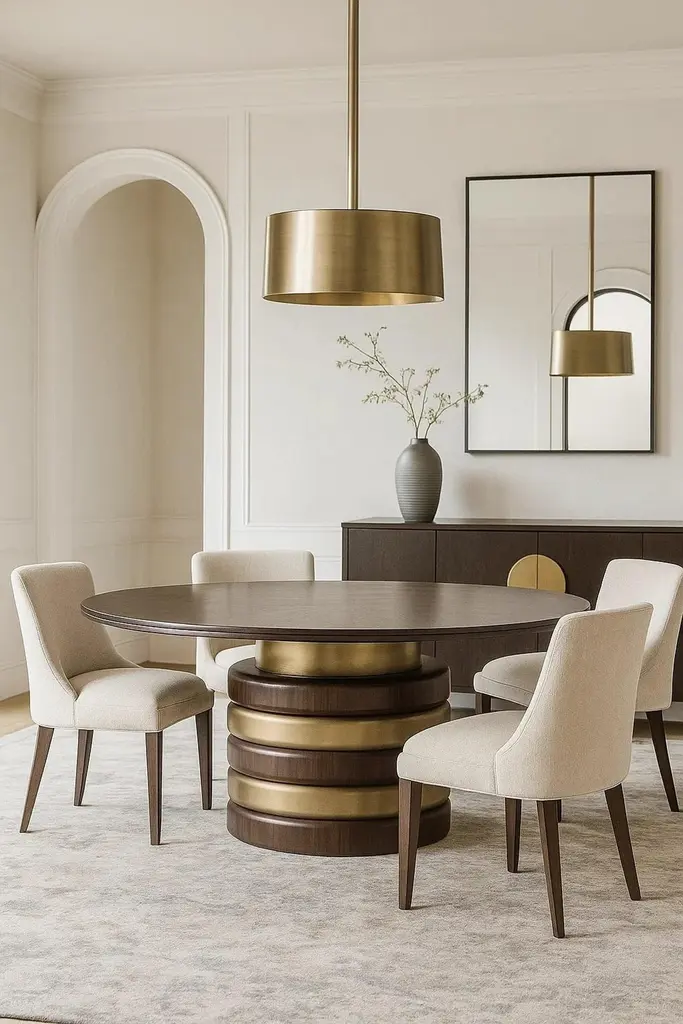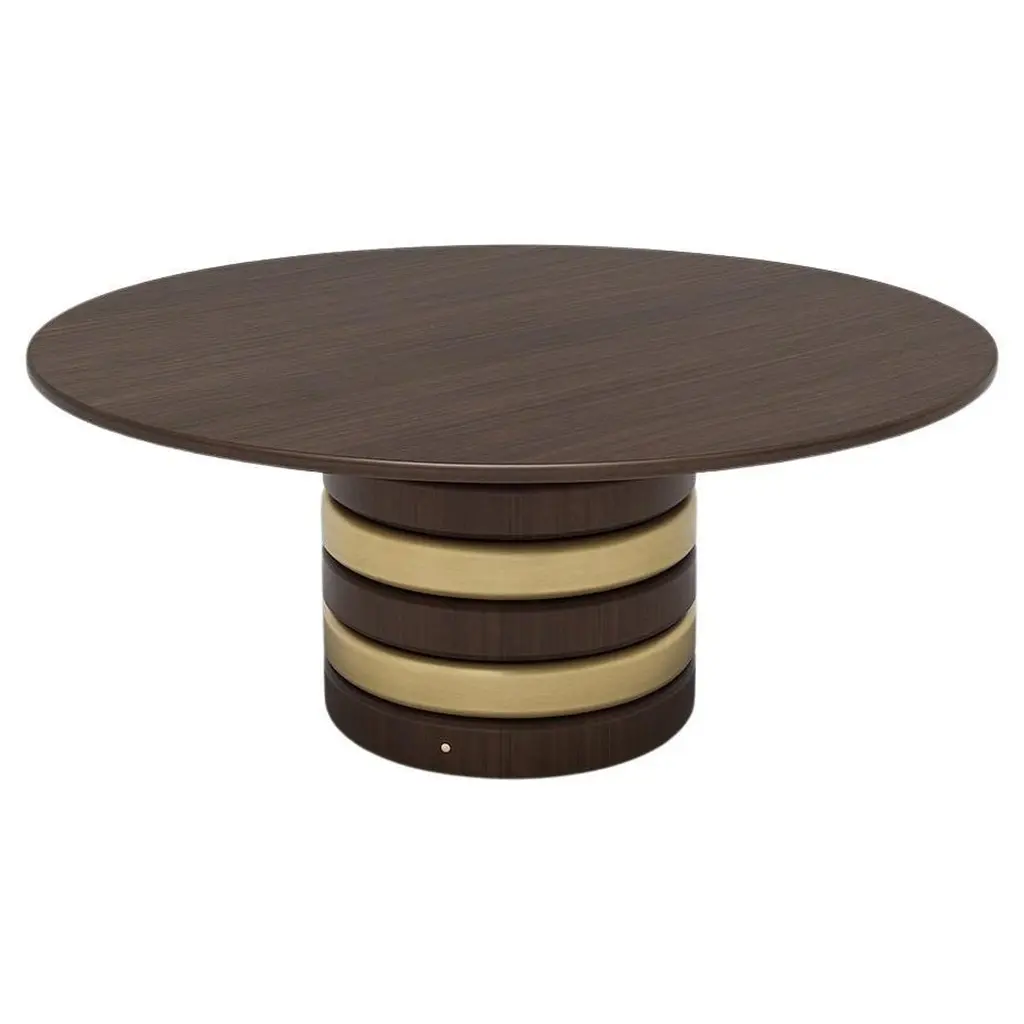 Art-Deco Style Round Dining Table In Walnut & Brushed Gold Base