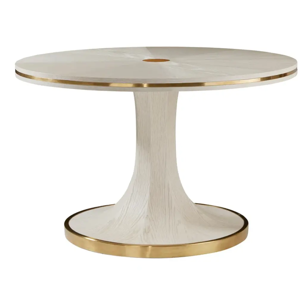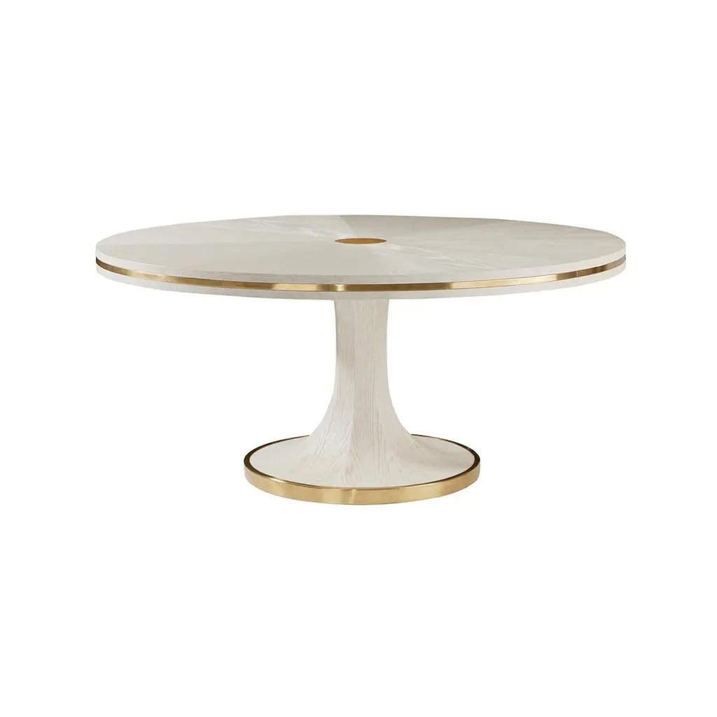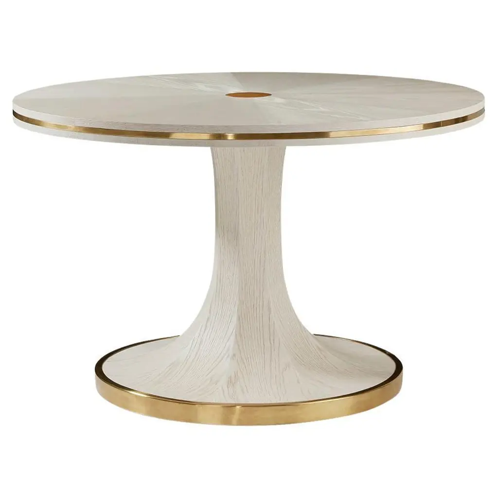 Introducing the Art Deco White Dining Table. With its whitewash oak veneer and rayed top centered by an antiqued brass round applique.The top with brass inlaid trim is raised on a tapered octagonal pedestal with a round brass mounted base that adds to the table's unique charm and makes it a standout piece.Dimensions: 60" W x 60" D x 30" H.