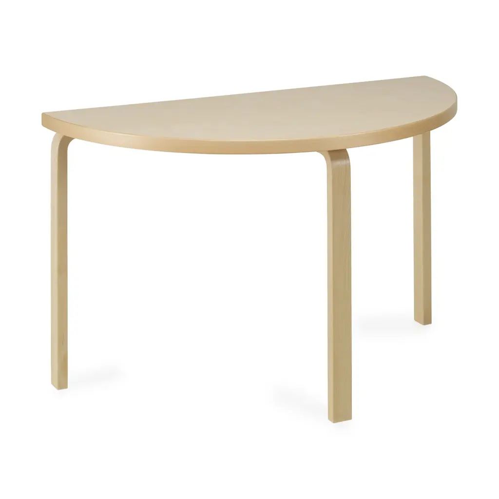 Designed to be used alone or with other Aalto tables, this versatile Half-Round Table 95 was designed by Alvar Aalto in 1935. Made from solid Finnish birch wood that has a warm, natural beauty and will age gracefully over time, the table is produced semi-industrially, adhering to strict criteria and a high level of handcraftsmanship. Use the Half-Round Table alone as a console or team one or more up with Aalto’s Rectangular Tables to create oval or semi-oval table possibilities. Combine two Half-Round Tables to create a cozy dining table for two people. Made in Finland from solid birch with a tabletop of birch veneer, high-pressure laminate and linoleum. It measures 29.25h x 47.25w x 23.5”d. Some assembly required. Both Alvar Aalto and the table’s manufacturer, Artek, is represented in MoMA’s collection.