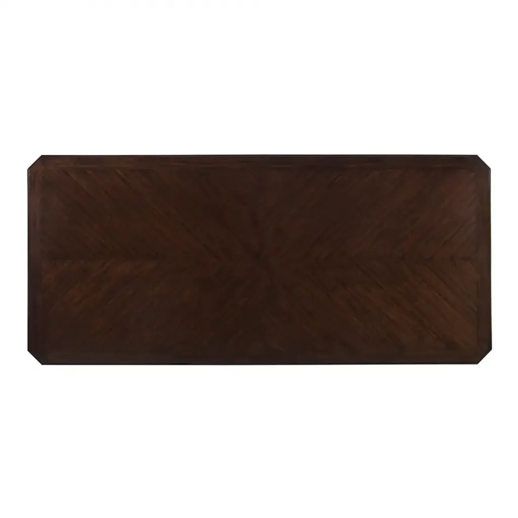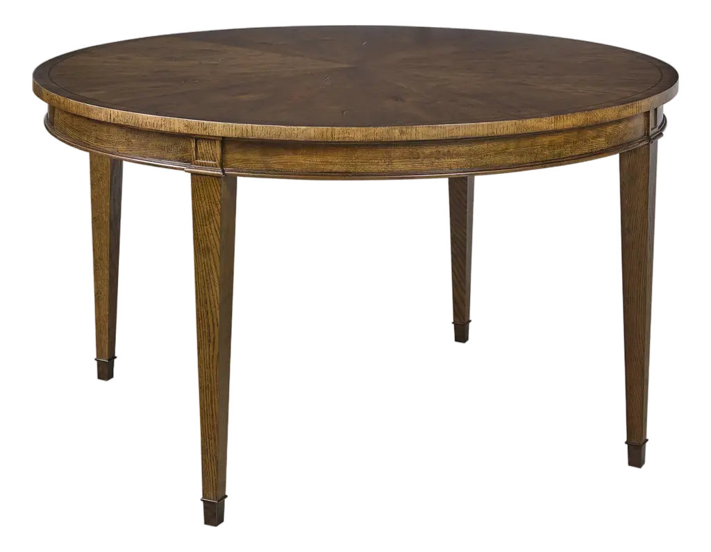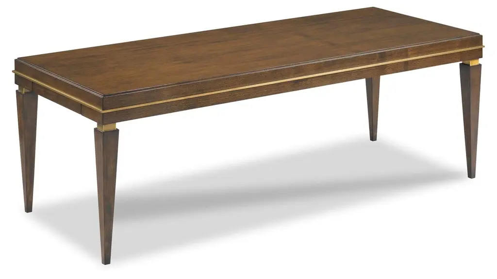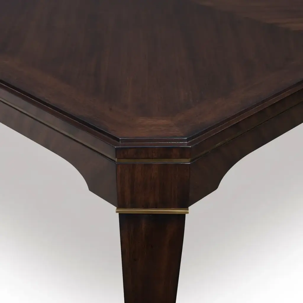 This rectangular dining room table consists of Walnut solids and Walnut veneer. Tall tapering legs are finished with brass ferrules. Brass trim accents the table apron as well as capping the tops of the legs. A book matched top includes edge banding. Finished in rich walnut. Includes two 22" leaves.