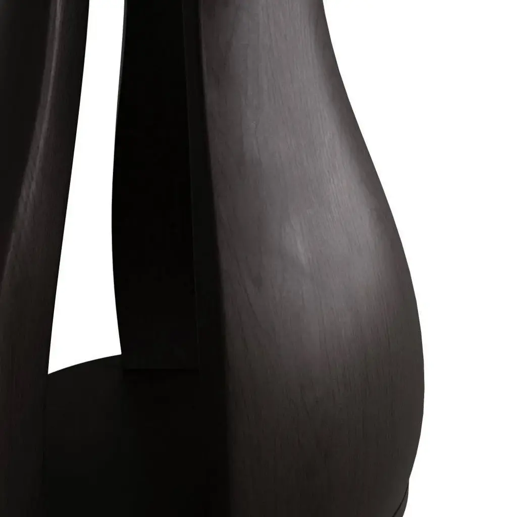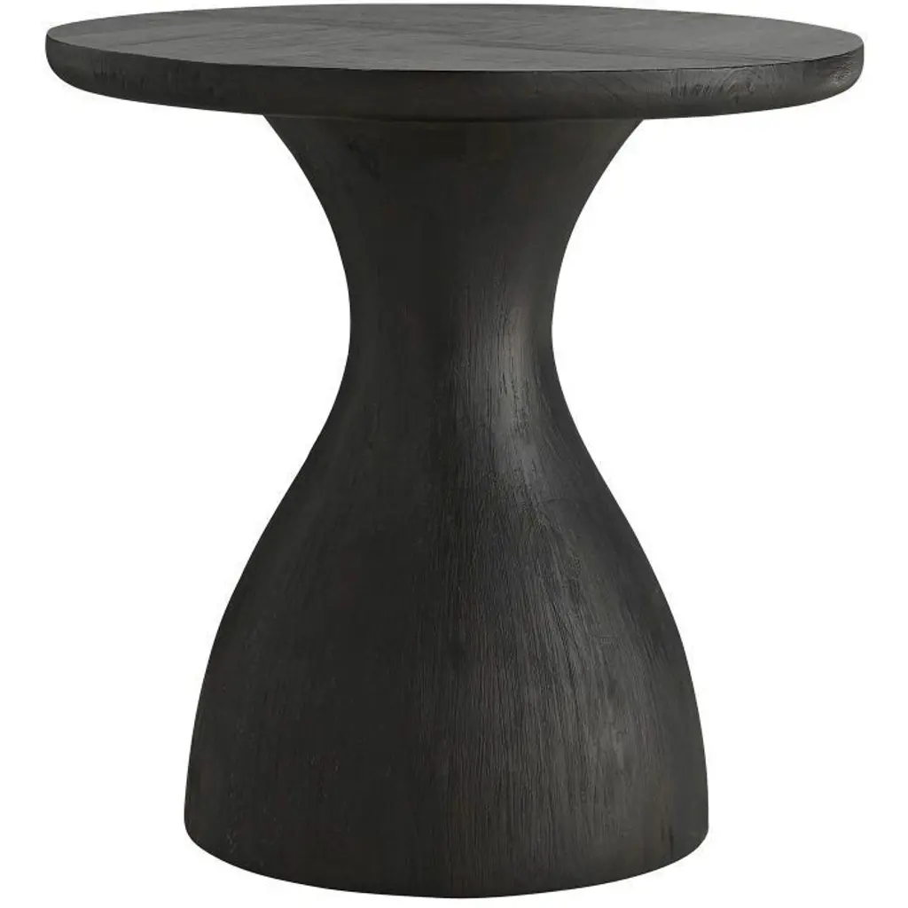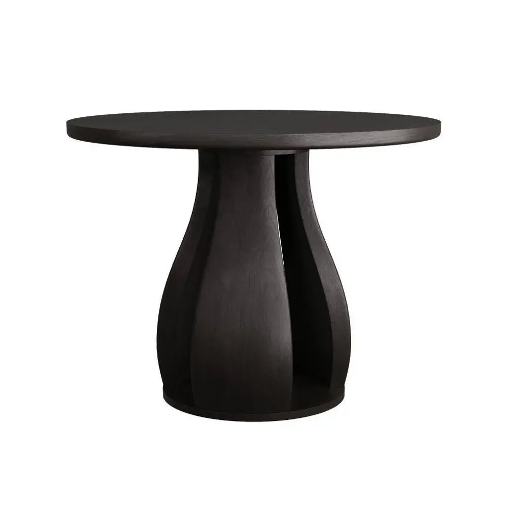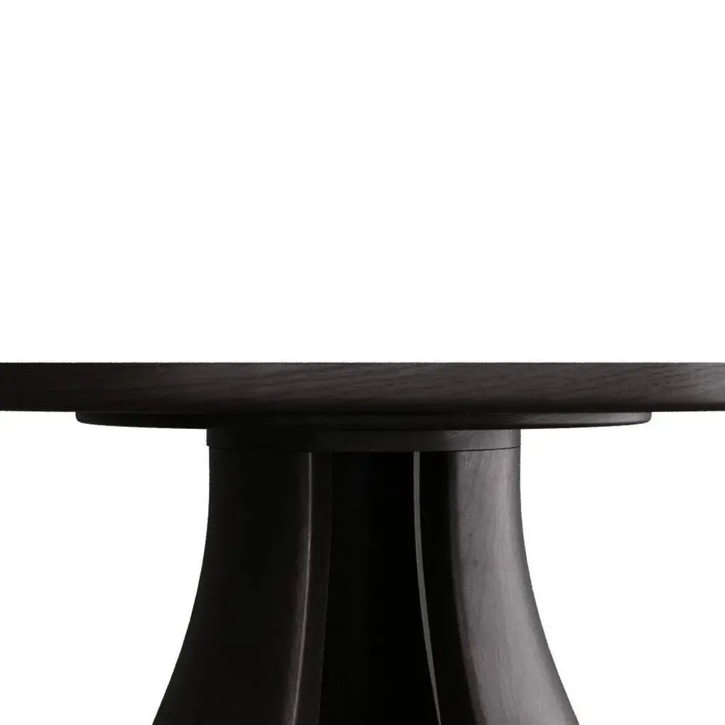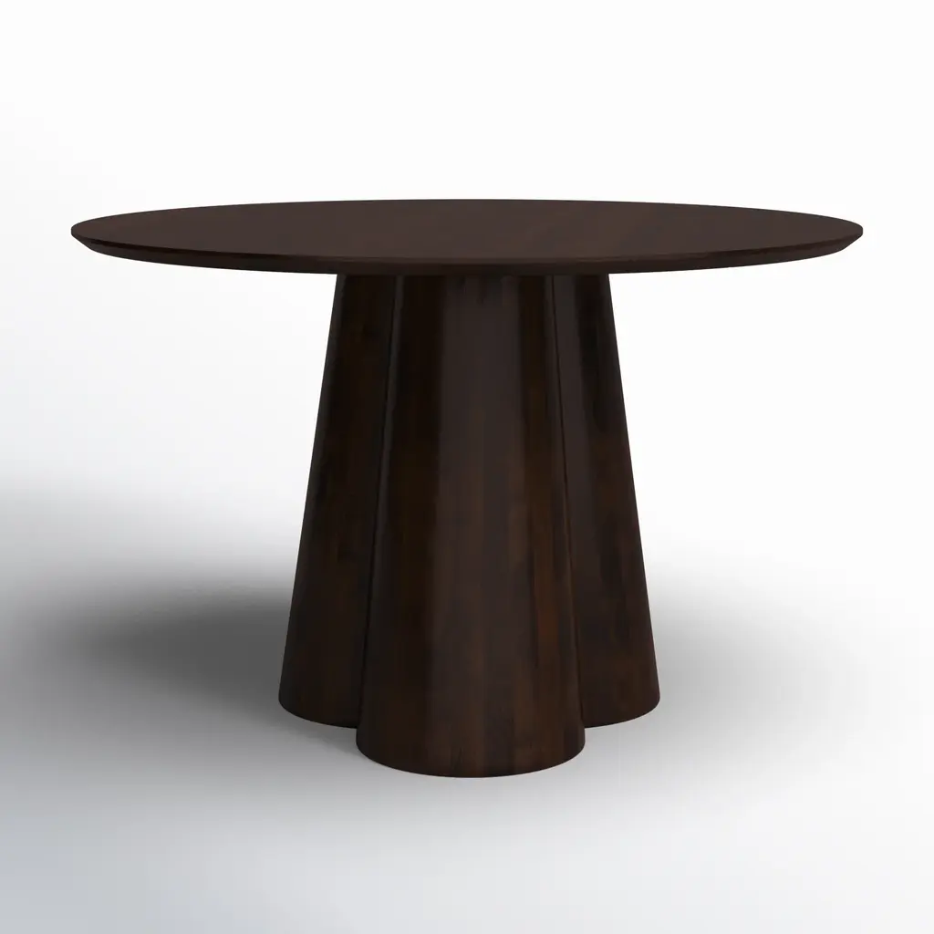 Designed to make a memorable first impression, the base of the bold Samara table is fashioned with carved cutouts to resemble the shape of a flower bud. The round pedestal table, in ebony mahogany, can stand out as an entry or dining table. Finish will vary.