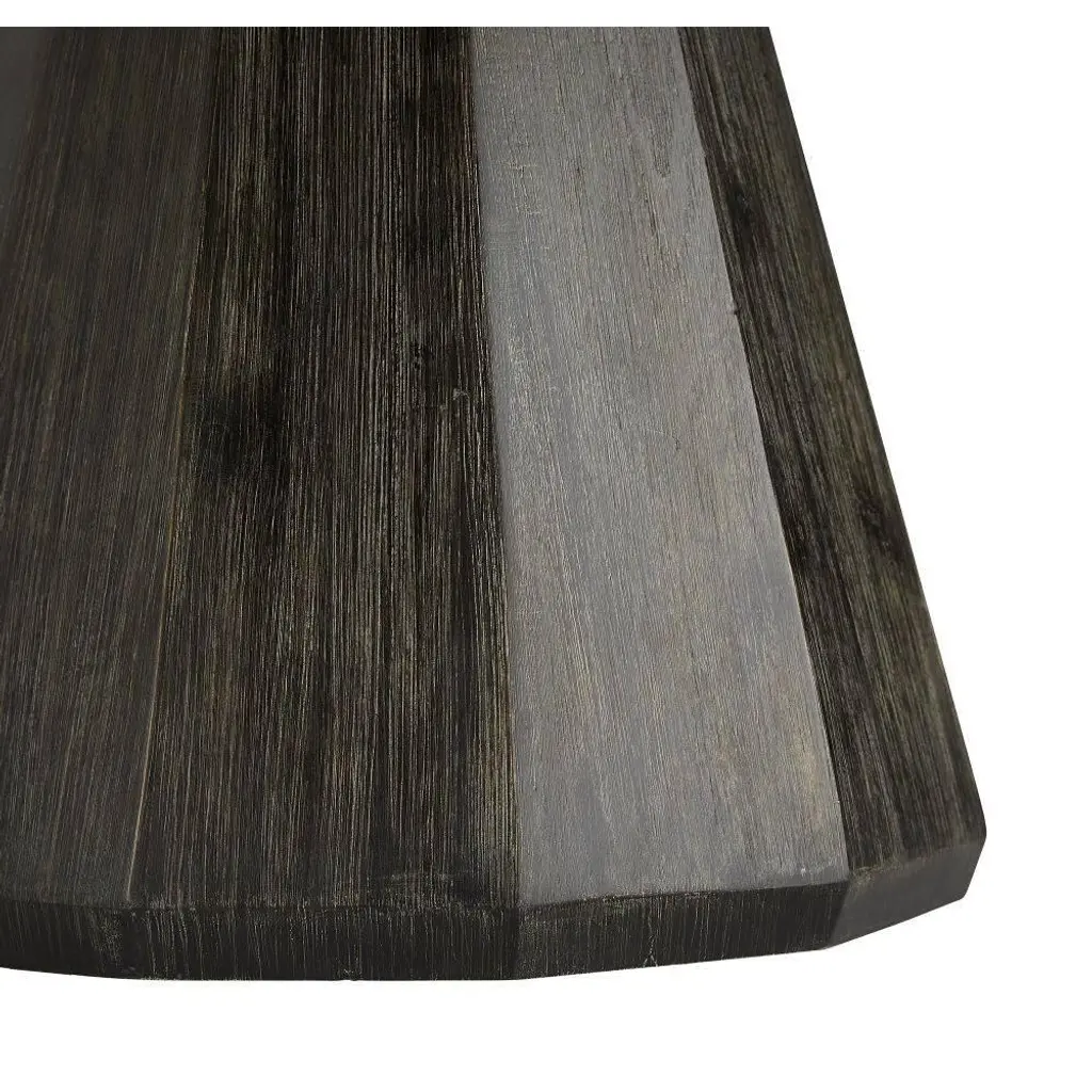 The collaboration of geometry, stone and gray finished wood creates an ultra-modern look. The tabletop is made of lava stone, an alternative to concrete that is lighter in weight. Featuring a lightly embossed texture and deep, geometric etchings aro und the rim, the top is finished in dark ash. The faceted base has grain textures, accentuated due to a sandblasted finishing process that has over 500 years of history. Built for dining, this table would also be perfectly sized for a grand entryway.