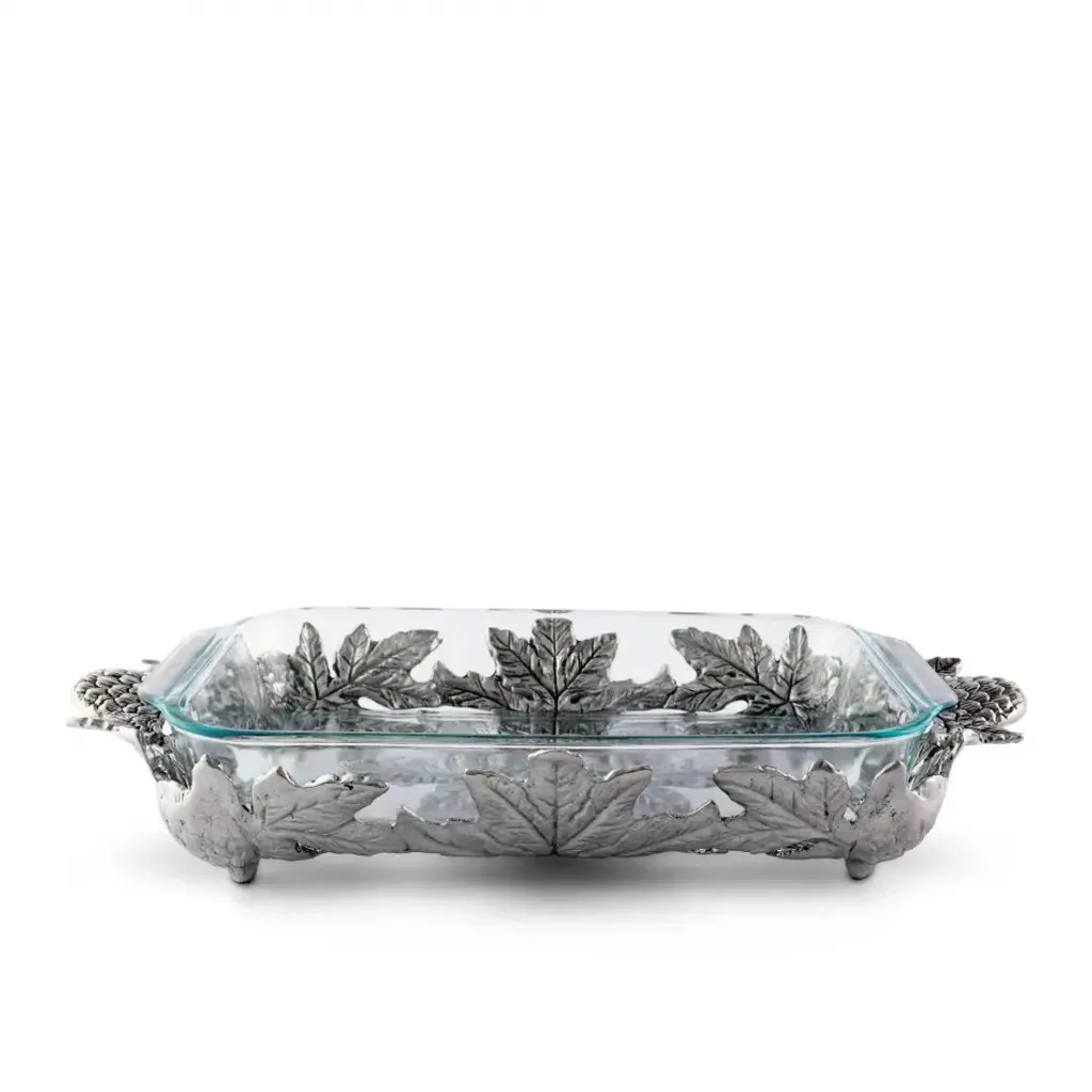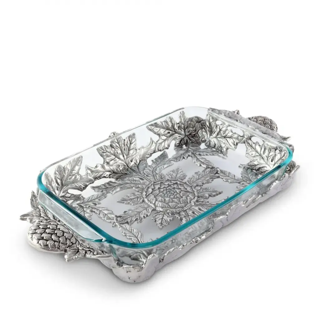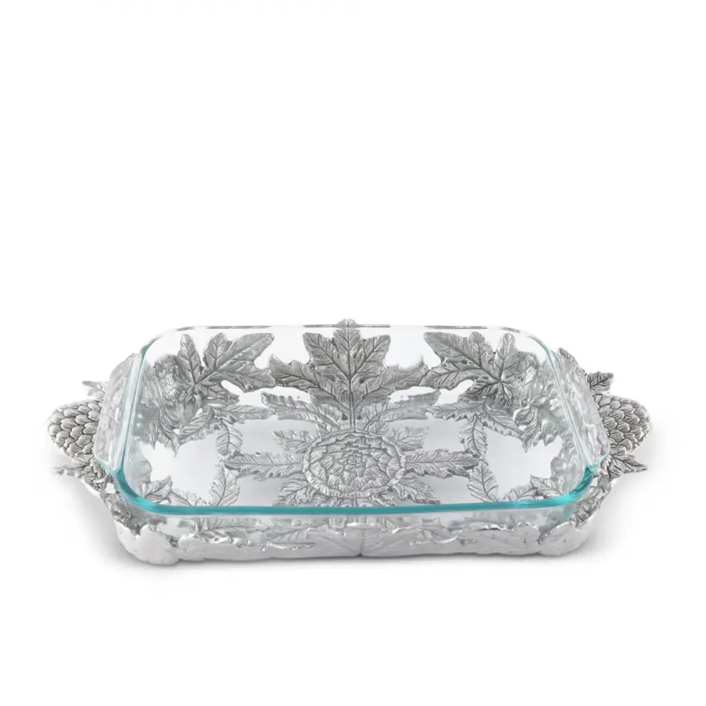At Arthur Court design we know that food presentation is important and is just as essential to the success of a dish as its taste and flavor. That's why our passionate designers and expert artisans conspire to bring the most elegant casserole dish holder. Hand-crafted in sand-cast aluminum to last a lifetime, our decorative serving tray is heat resistant and perfectly fits the included 9''x13'' Pyrex glass. Makes your dining table look great while protecting your furniture and counters from the hot baking dish.