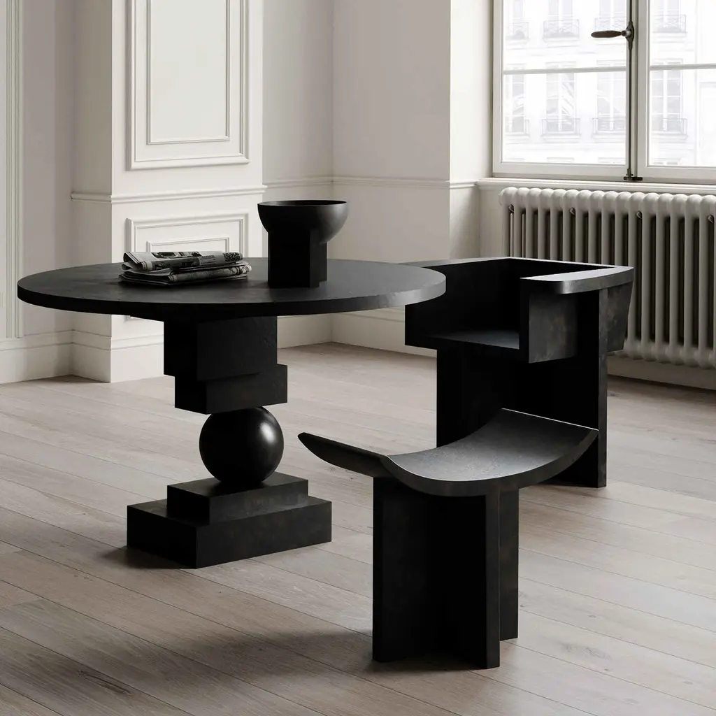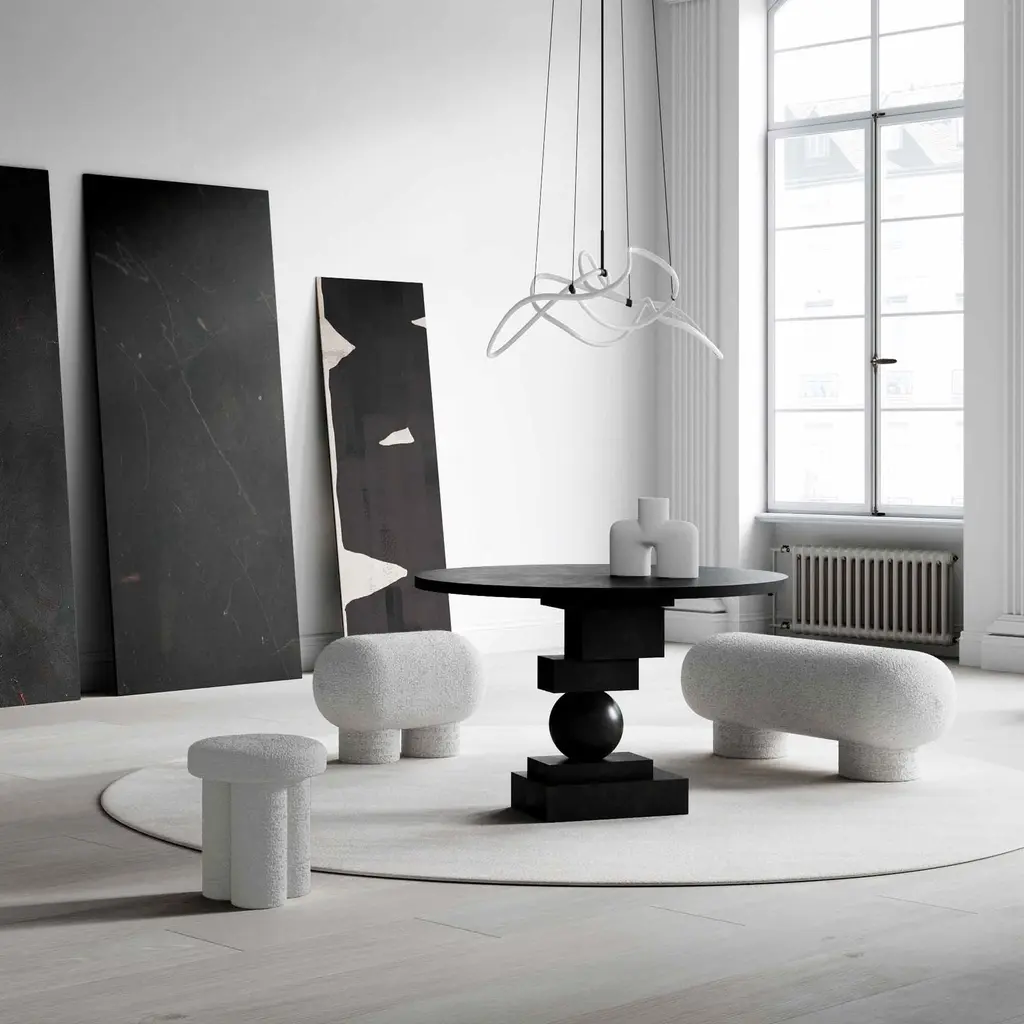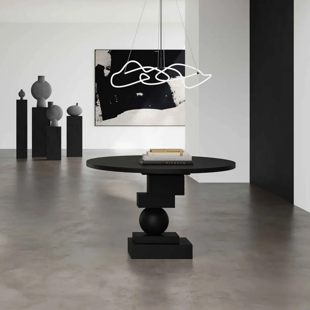 The Artist sculptural dining table is a masterpiece of geometric design, transforming any dining area with its striking presence. Crafted from cast fiber concrete, it sports a stone-like surface adorned with subtle holes and color variations, showcasing a raw and tactile aesthetic. Its sturdy build channels a brutalist style, particularly when paired with Brutus Dining Chairs, reinforcing an architectural vibe. Practical for everyday use, this sculptural dining table combines durability with visual impact, making it ideal for various dining scenarios. Each table is individually hand-painted, ensuring no two pieces are identical and enhancing its unique character. The table’s versatile size and design seamlessly fit into different interior styles, from modern to traditional, making it a commanding yet harmonious focal point in any room. This blend of artistic expression and functionality makes the Artist Sculptural Dining Table a standout choice for those seeking a durable, aesthetically pleasing dining option.