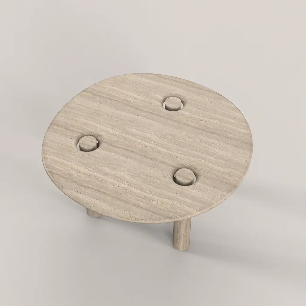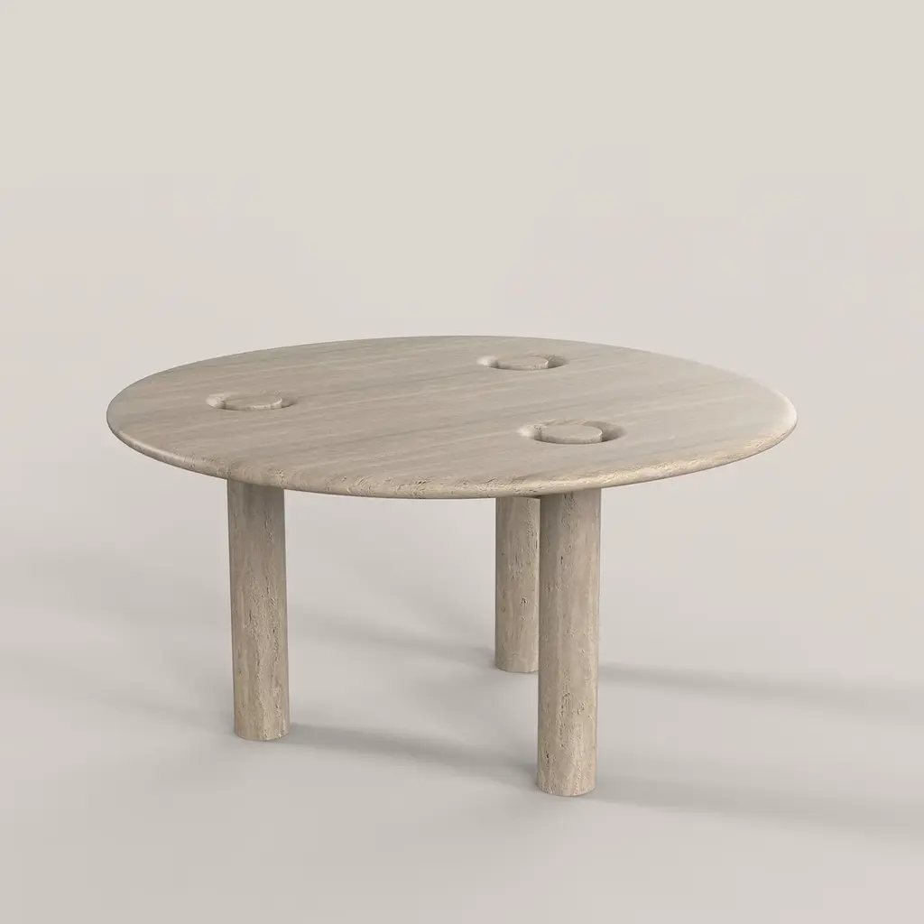 Asido Stone dining table, crafted from travertine, features soft, organic shapes and a thoughtful arrangement of elements. The legs gently sink into the top, creating a seamless, harmonious design. Limited edition of 150, each with a numbered metal plaque for authenticity. Customization options are available, please contact the concierge for more information.