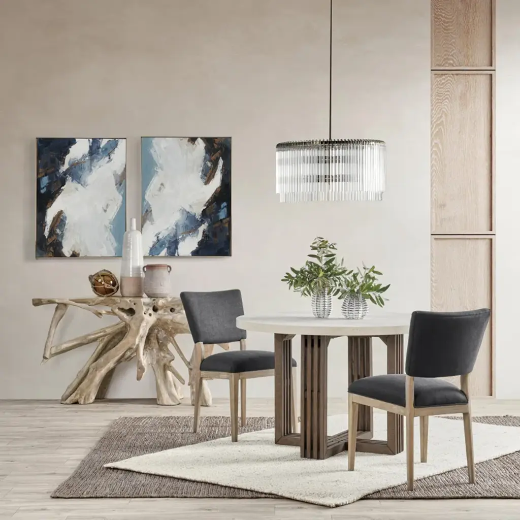 The organic warmth of reclaimed pine wood contrasts and balances the sharp, linear design of this dining table. Topped with durable yet lightweight concrete laminate, this table offers chic transitional style with an industrial edge while the aged wood offers the distinctive knots, grain patterns, and character inherent to reclaimed wood.