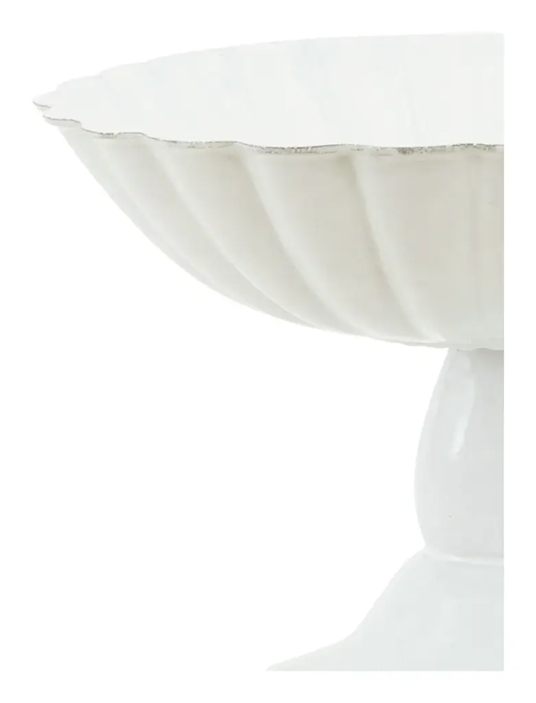 Make a pretty display of your produce with the vintage-inspired Peggy Fruit Stand. Modeled after 19th century pottery designs, this delicate footed dish comes to us from renowned ceramicist Astier de Villatte’s historic Paris workshop, housed in what was once the atelier of Napoleon’s own silversmith. There, it was handmade from black terracotta clay following old-school methods passed down for generations and finished with the brand’s signature milky white glaze. Perfect for bringing a little antique elegance to your kitchen counter, we also love Peggy filled with fresh fruits for a lush dining table centerpiece. •black terracotta clay•white glaze•astier de villatte•handmade in paris •each is unique Dimensions •12.5" diameter x 9"H Care Instructions•handwash only •not microwave safe