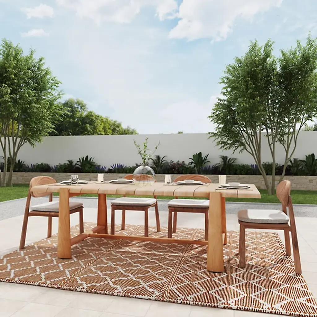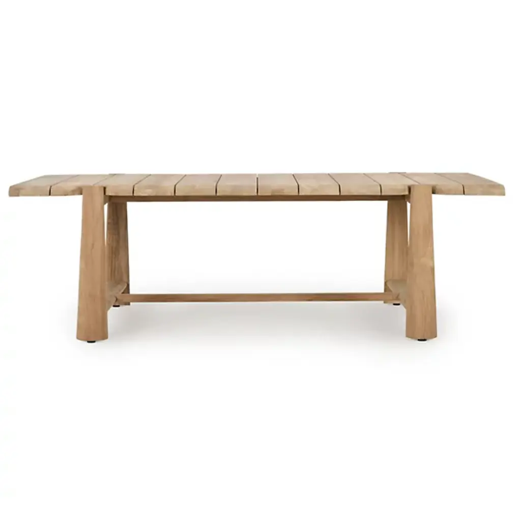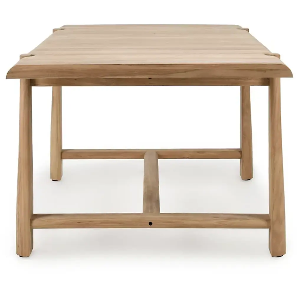 The Aston Outdoor Dining Table from Classic Home features an innovative design with tapered legs and crosswise planks, offering a bold and modern twist perfect for various styles, from contemporary to farmhouse. Crafted from premium teak wood, its unsealed surface showcases a soft matte finish, highlighting the wood’s natural vibrancy and organic energy. Combining timeless aesthetics with exceptional durability, this table is ideal for outdoor spaces, blending elegance with long-lasting functionality.