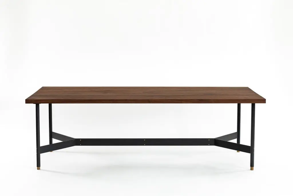 The AT11 performs beautifully as a dining table, but the detailing would scale well to any size, allowing for applications such as conference tables for the office and coffee tables for the home. The materials are handcrafted from solid materials including hardwood, cold rolled steel and bronze. Shown in solid walnut and blackened hot-rolled steel. Dimensions: 96” L x 36” W x 29.5” H All of our solid hardwood is sustainably sourced from Pennsylvania. All metalwork is handcrafted in our Newburgh, NY workshop.