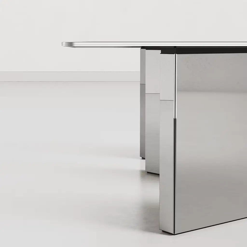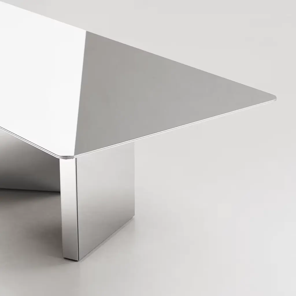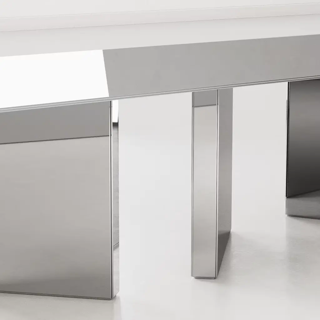 The Atomic dining table features a smoked mirror top paired with a tempered glass plate, diamond-cut on the underside, supported by three asymmetrical legs. The legs are crafted from a wooden structure, covered in mirror, and can be customized in clear, bronzed, or smoked mirror finishes. The design embodies the balance between chaos and order, inspired by the 1980s’ artistic fervor and the iconic elegance of Italian high fashion.