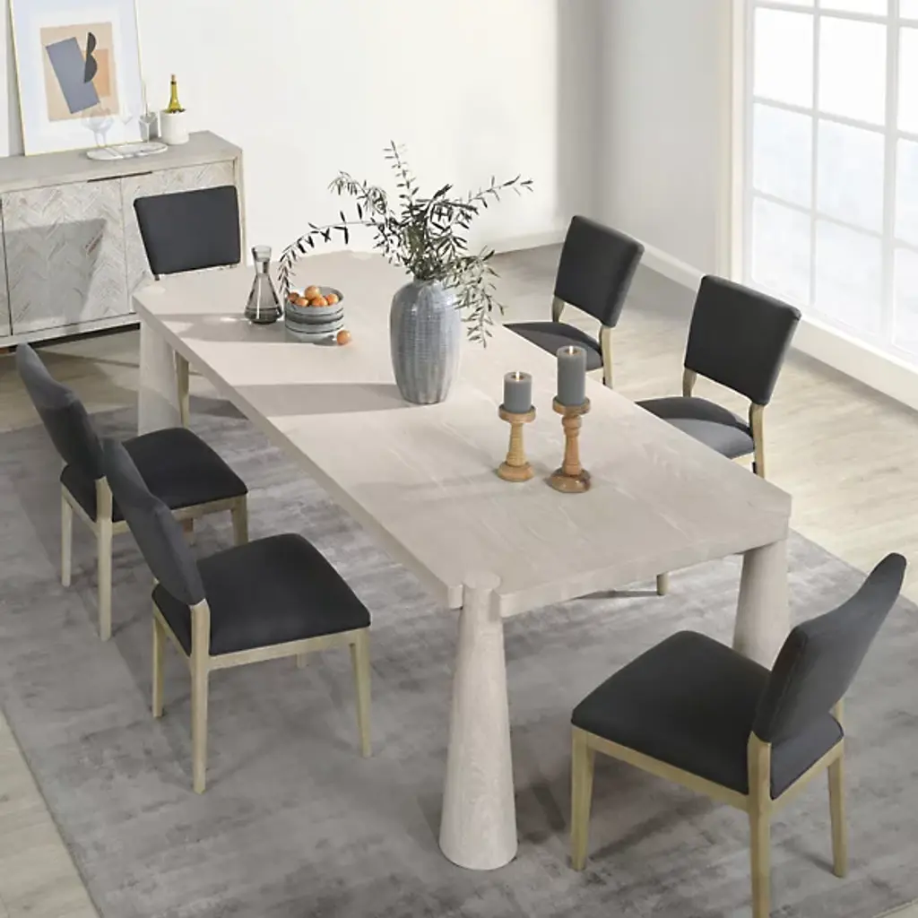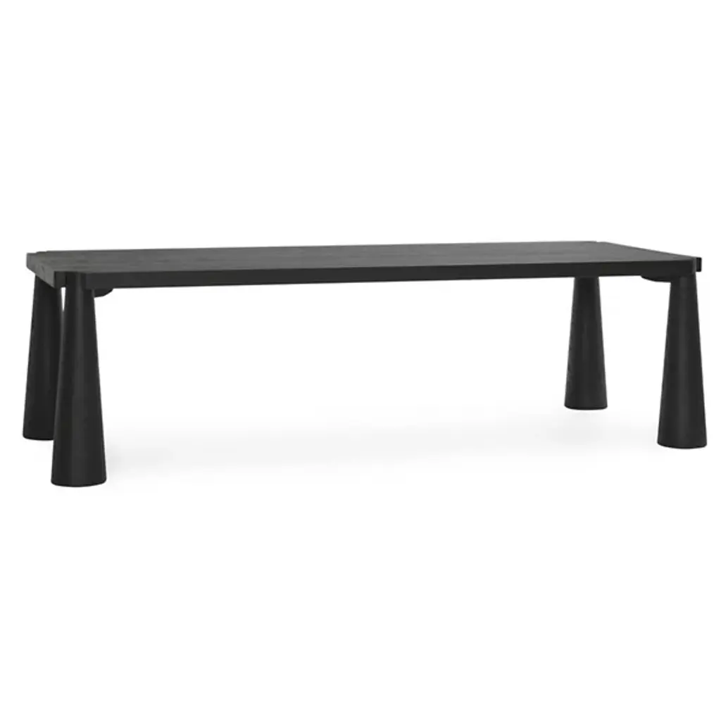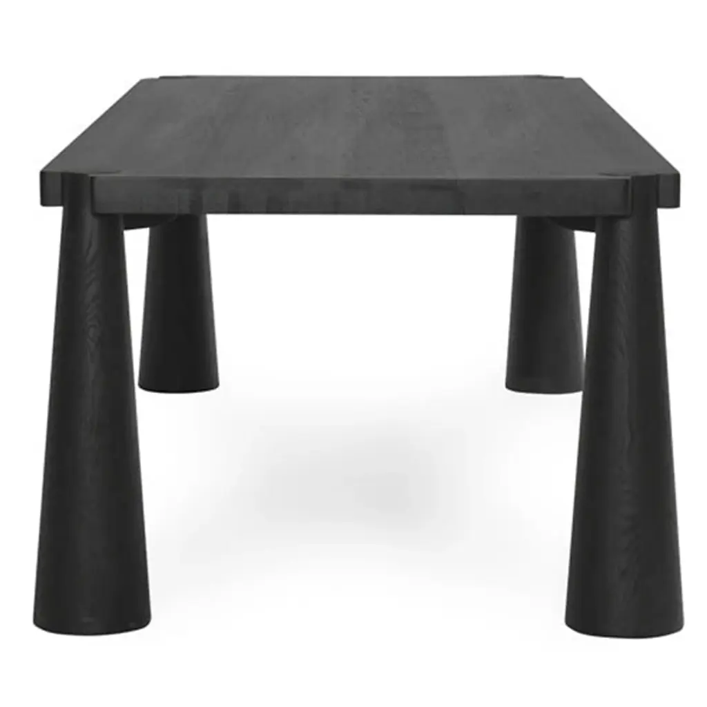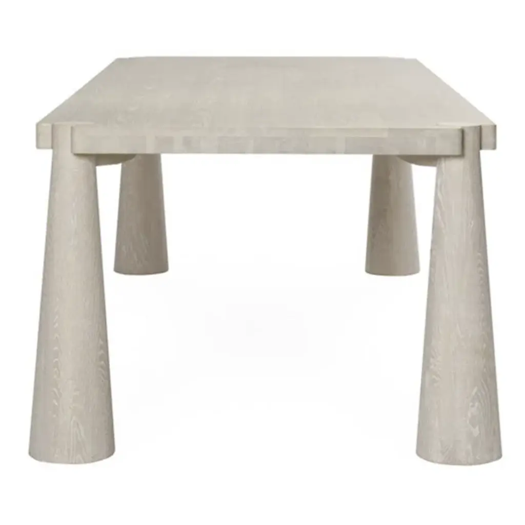 The Atrop Dining Table from Classic Home reveals its craftsmanship through exposed corner joinery that highlights the junction between the tabletop and legs. Conical tapered legs draw the eye while providing stable support for gatherings of up to eight people. Solid oak construction ensures this table will withstand decades of daily use and special occasions. The hand-finished matte gloss treatment protects the wood while allowing its natural character to remain visible through subtle texture variations. This table anchors dining spaces with a confident presence, making it adaptable to various interior approaches from minimal to more traditional settings.