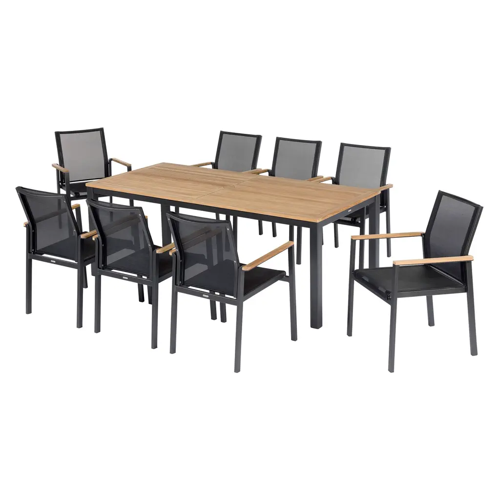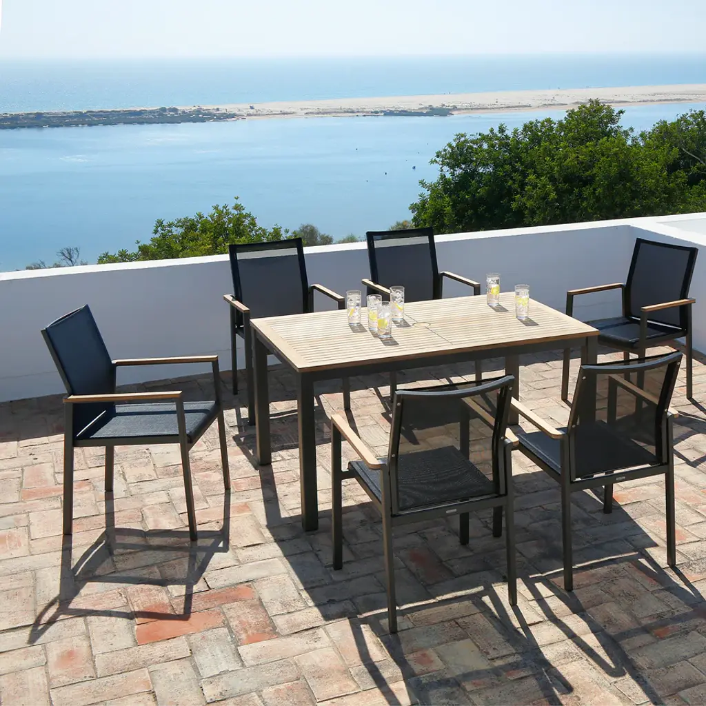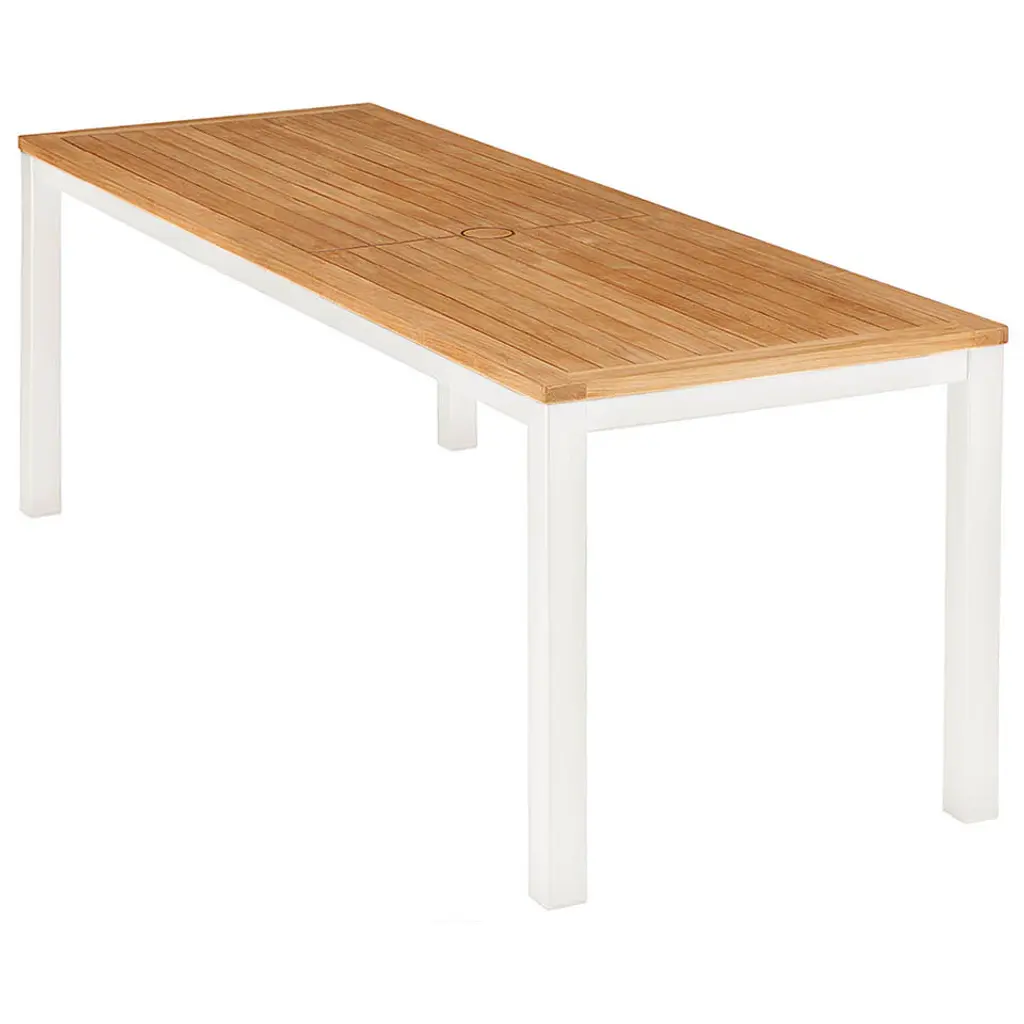 A contemporary outdoor dining option with traditional flair, the Aura Rectangular Dining Table from Barlow Tyrie mixes mediums for a sturdy design ready to take on the elements. Featuring a powder-coated aluminum frame with a solid teak wood top, this table is outfitted with an umbrella hole to provide shade when dining al fresco. Pair with the matching Aura Armchair for a cohesive dining set-up to enjoy all season long.Highlights