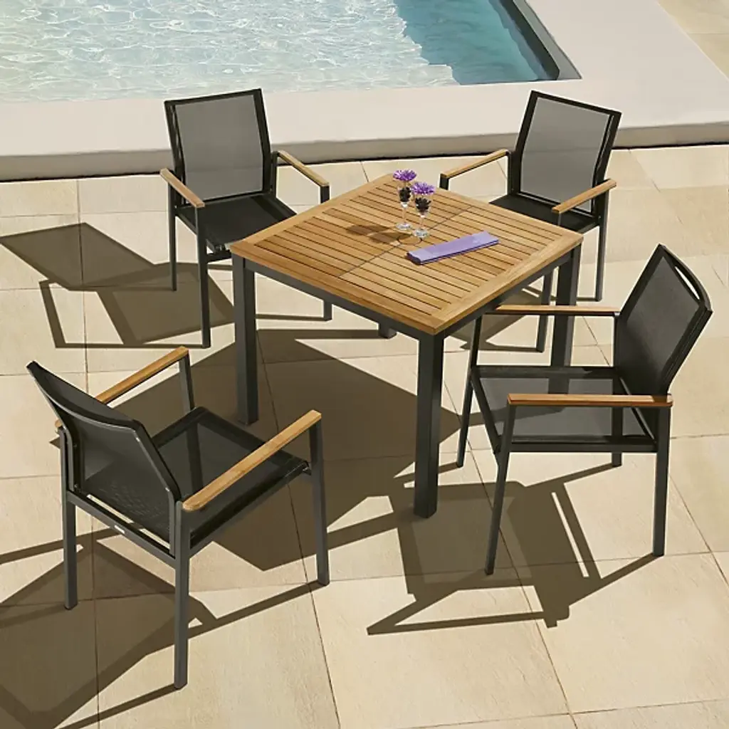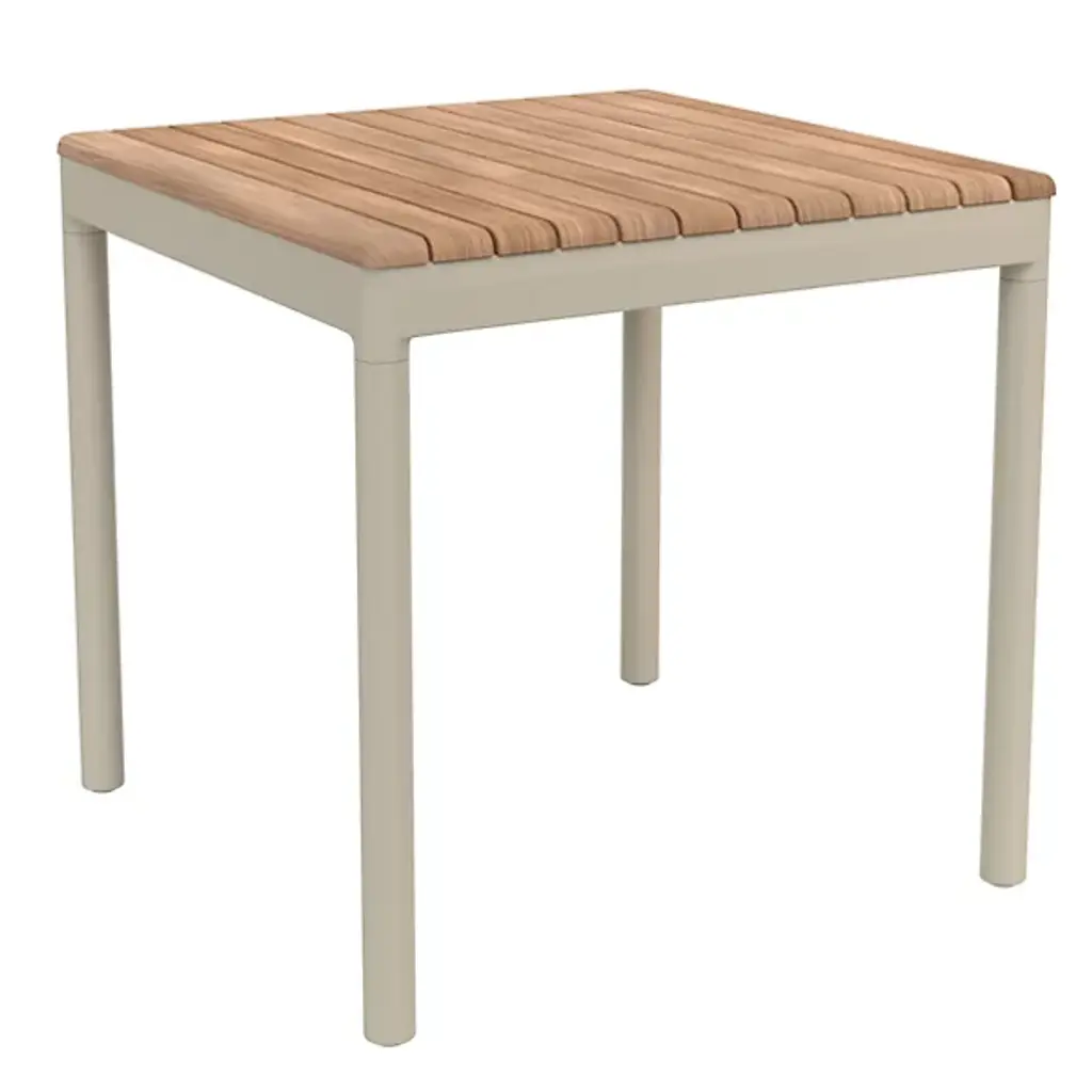 The Aura Square Outdoor Dining Table with Teak Top from Barlow Tyrie beautifully integrates contemporary style with practical function for your patio or terrace. This outdoor dining table is crafted from powder coated aluminum and durable teak, offering a stable and stylish complement to any outdoor setting. Incorporating an umbrella hole that includes a teak plug, it caters to varied weather requirements. Ideal for decking or terrace dining, it enhances your outdoor dining experience with its sleek design.