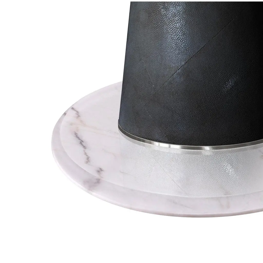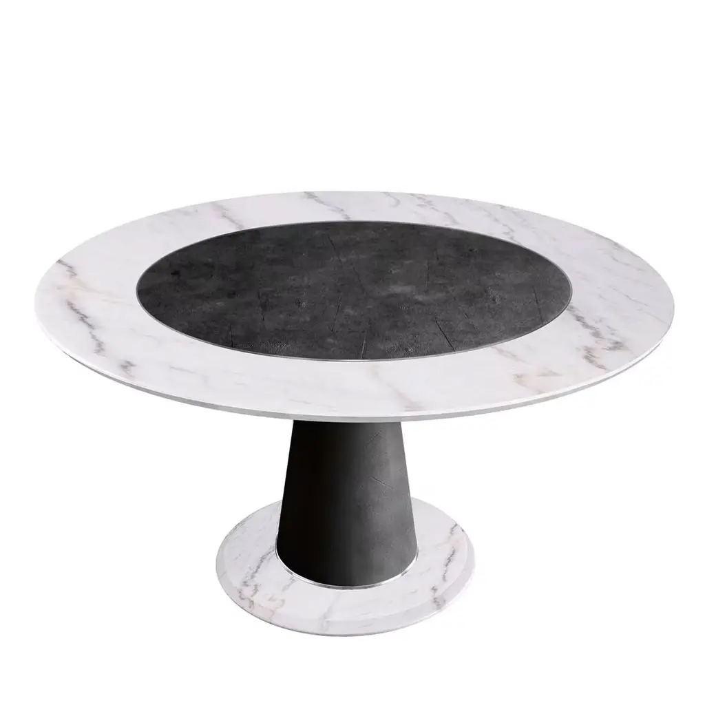 Imposing and enriched with refined accents, this extraordinary dining table creates a luxurious ambiance in a modern and classic dining room. Entirely crafted of white Statuario marble, this table features a round top supported by a cone-shaped leg raised on a round base. Both the inner circle at the top and the single conical leg boast a stunning dark brown scagliola shagreen outlined with polished steel. This unique technique dates back to the 16th century and provides a complex texture and color of great aesthetic quality. Customization in size and colors is available upon request.