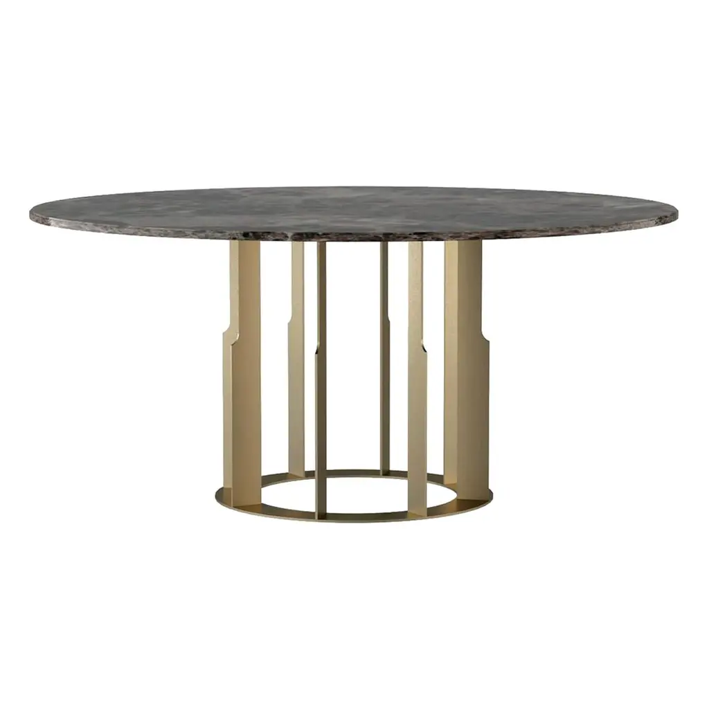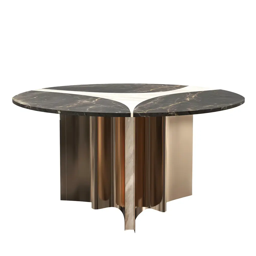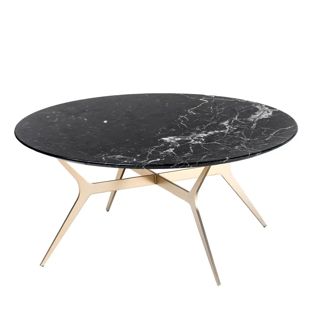 A pleasure to sit around during evening dinners or special occasions, this spectacular table captures a modern, minimalist aesthetic. The top is fashioned of Nero Guinea marble, prized for its deep black color and red, yellow, and white veining. Six tall column-like legs, circular base, and five orb-shaped feet support the piece, their galvanized bronze finish evoking the warm hues of the marble's veins.