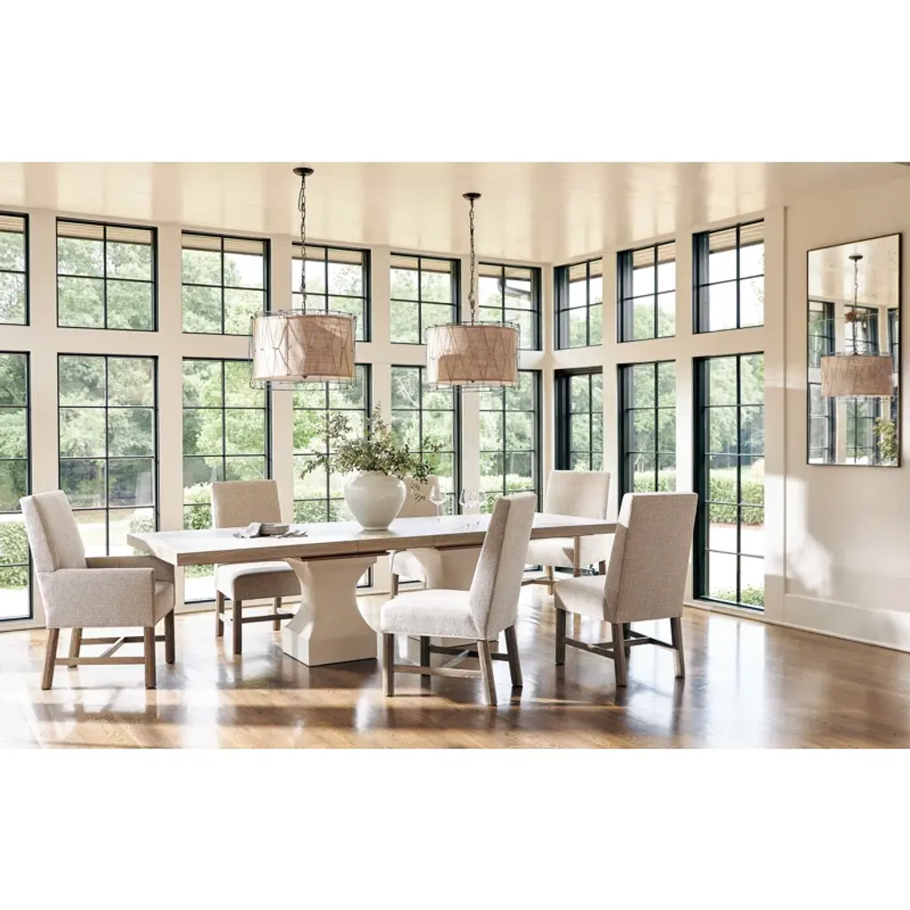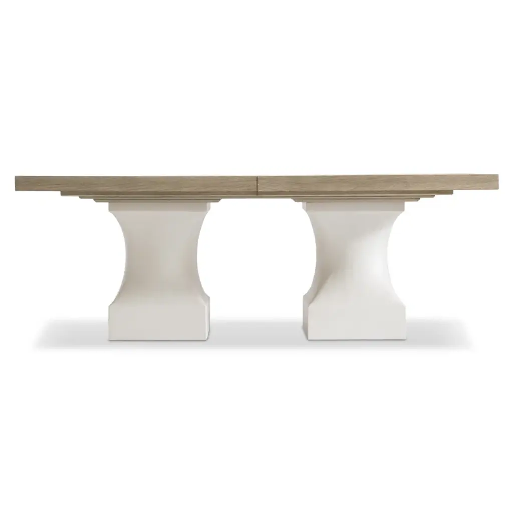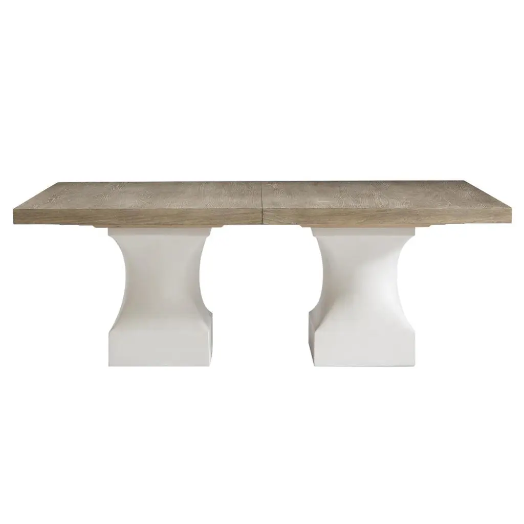 Sleek sculptural forms elevate the simple lines of the Aventura Dining Table. The table pedestals are formed with concave cast resin over a square base in our Tusk finish. The wood top, which includes two 20-inch leaves, offers a stunning contrast in the warm Marcona finish.