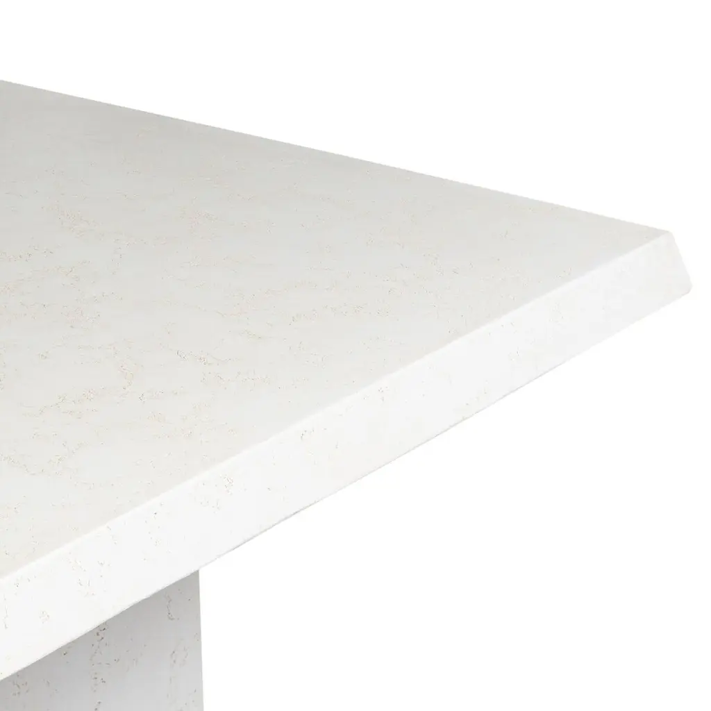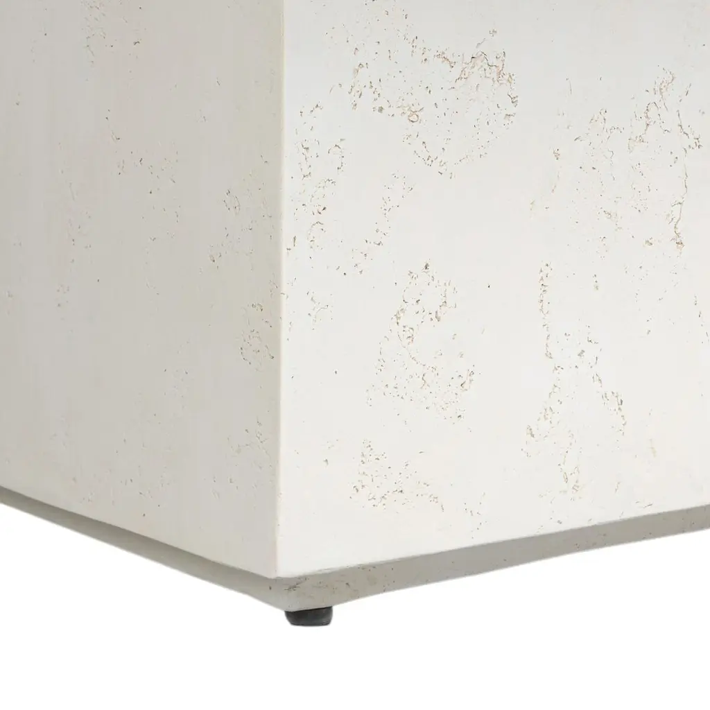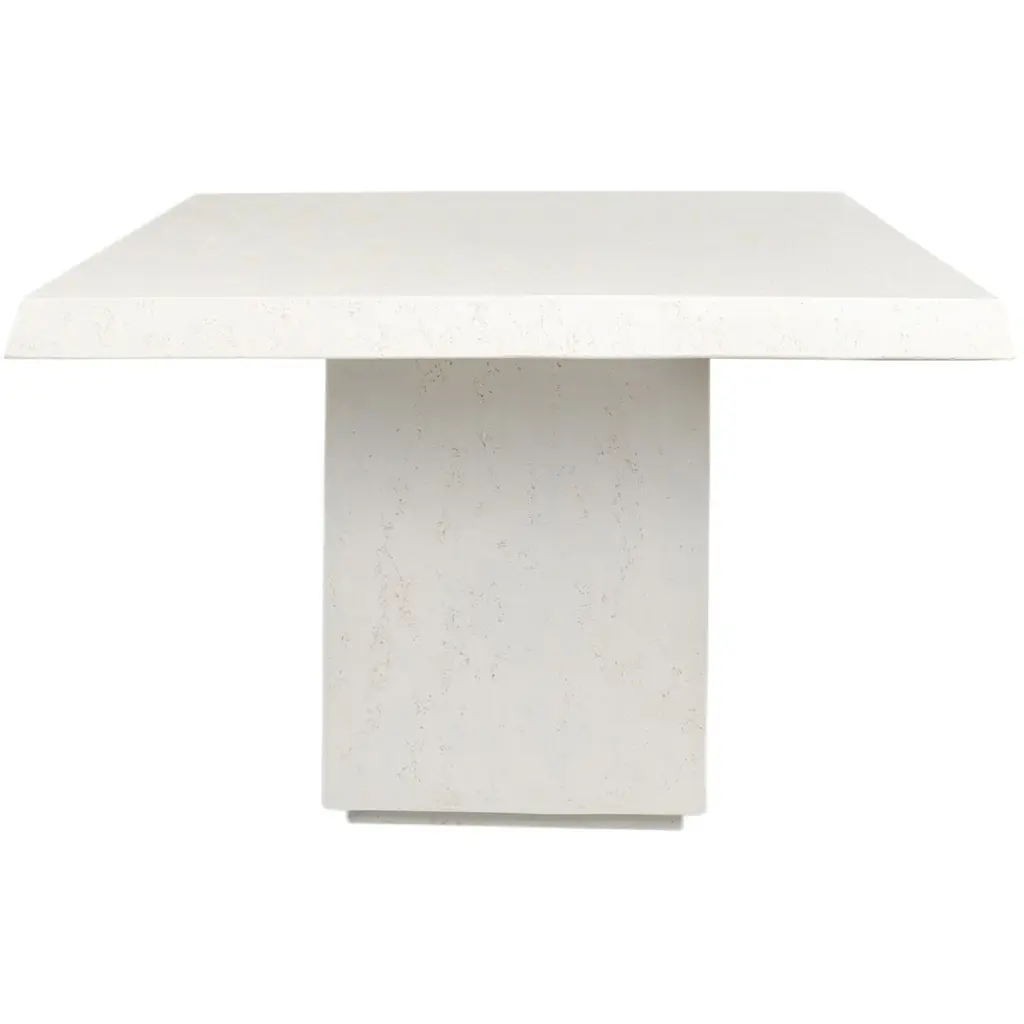 Simply shaped with a rectangular pillar and subtle plinth base, this outdoor dining table features a soft, parchment feel, complemented by a reverse bevel edge for visual intrigue. Cover or store indoors during inclement weather and when not in use. A design collaboration by Amber Lewis and Four Hands.