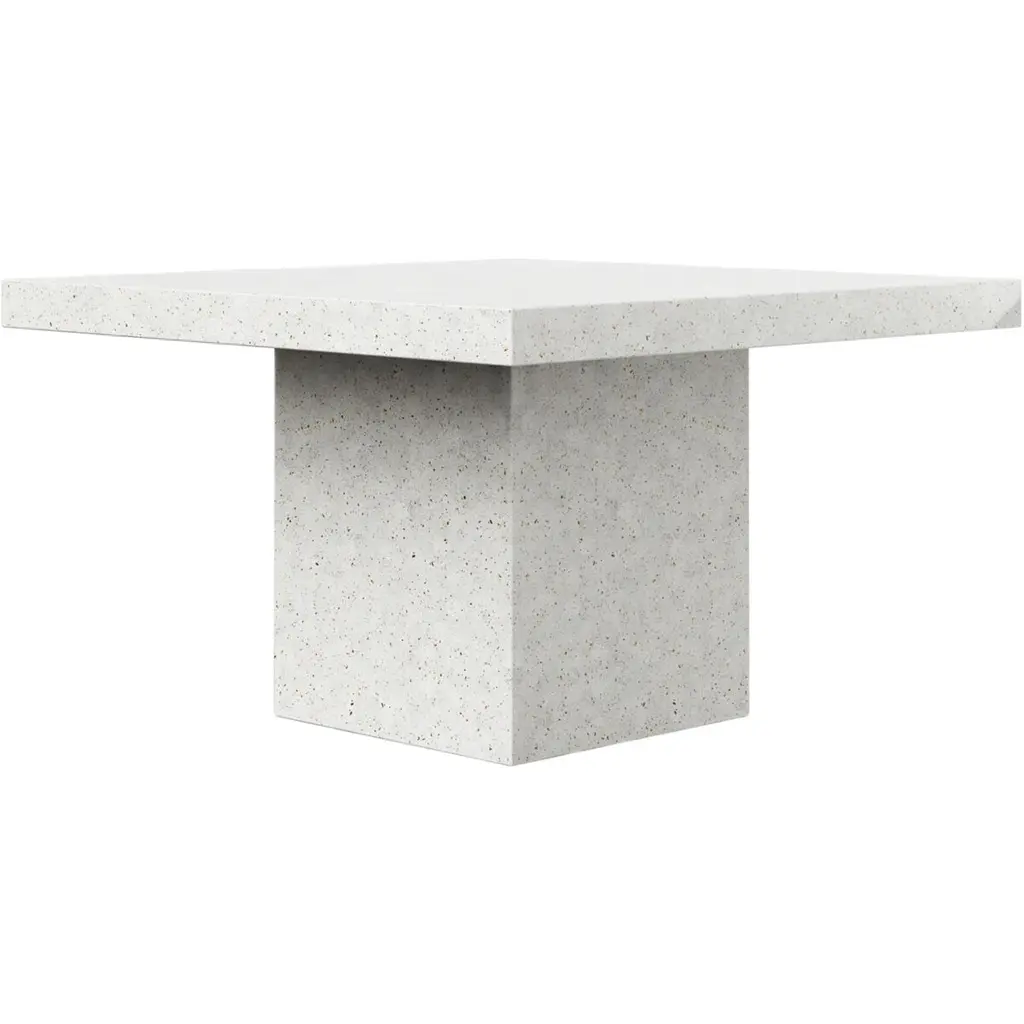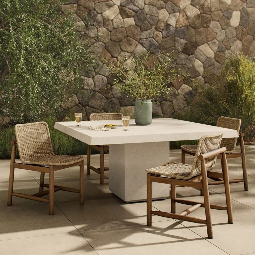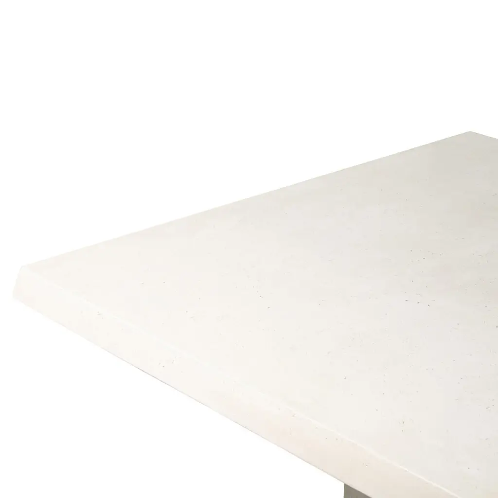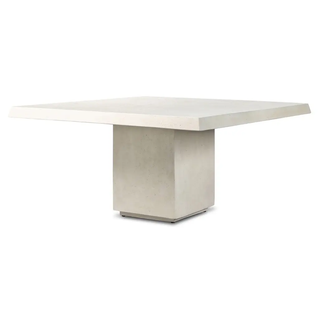A design collaboration by Amber Lewis and Four Hands. Simply shaped with a square pillar and subtle plinth base, the aged white concrete finish of this outdoor dining table features a soft, parchment feel, complemented by a reverse bevel edge for visual intrigue.